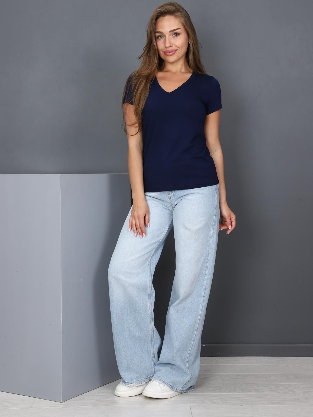 Женская футболка выполнена из трикотажного полотна "вискоза". Футболка полу прилегающего силуэта, с рукавом, горловина с глубоким V-образным вырезом, обработанным бейкой.