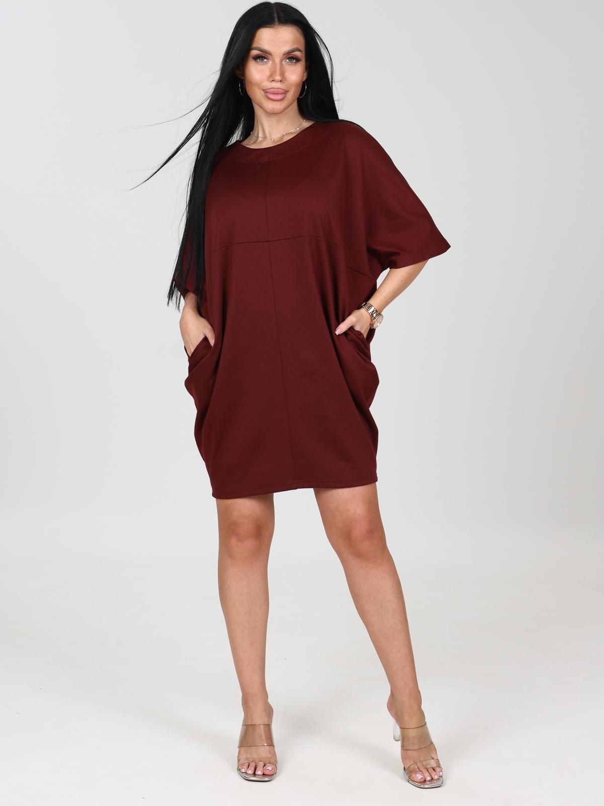 Женское платье выполнена из трикотажного полотна "милано". Платье силуэта "бочонок", с карманами в боковых швах, с рукавом "летучая мышь", круглая горловина обработана обтачкой.
