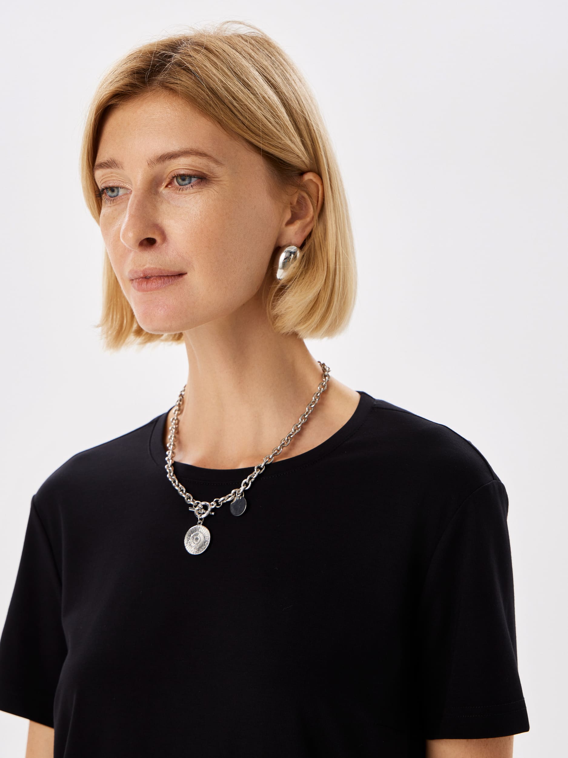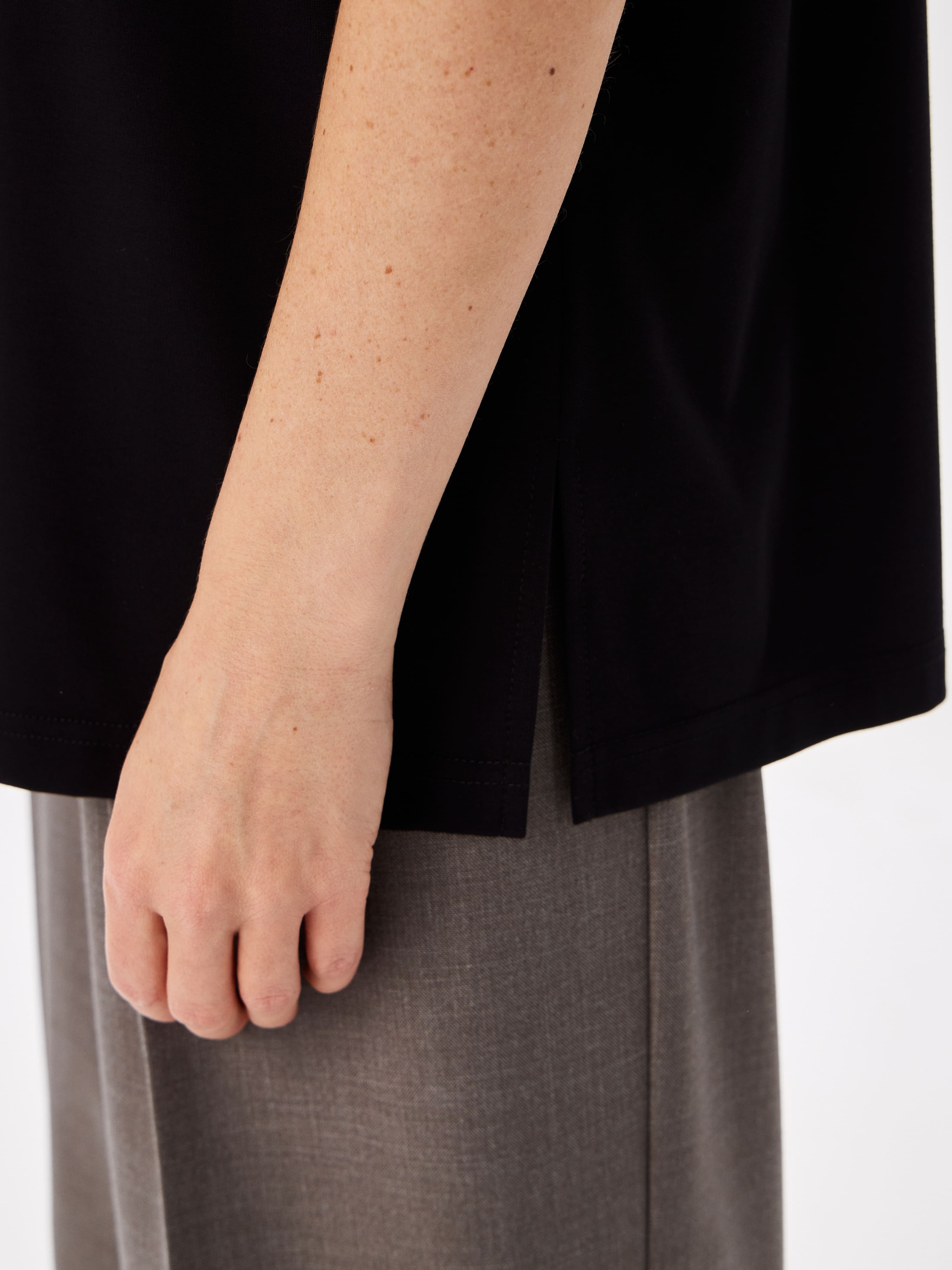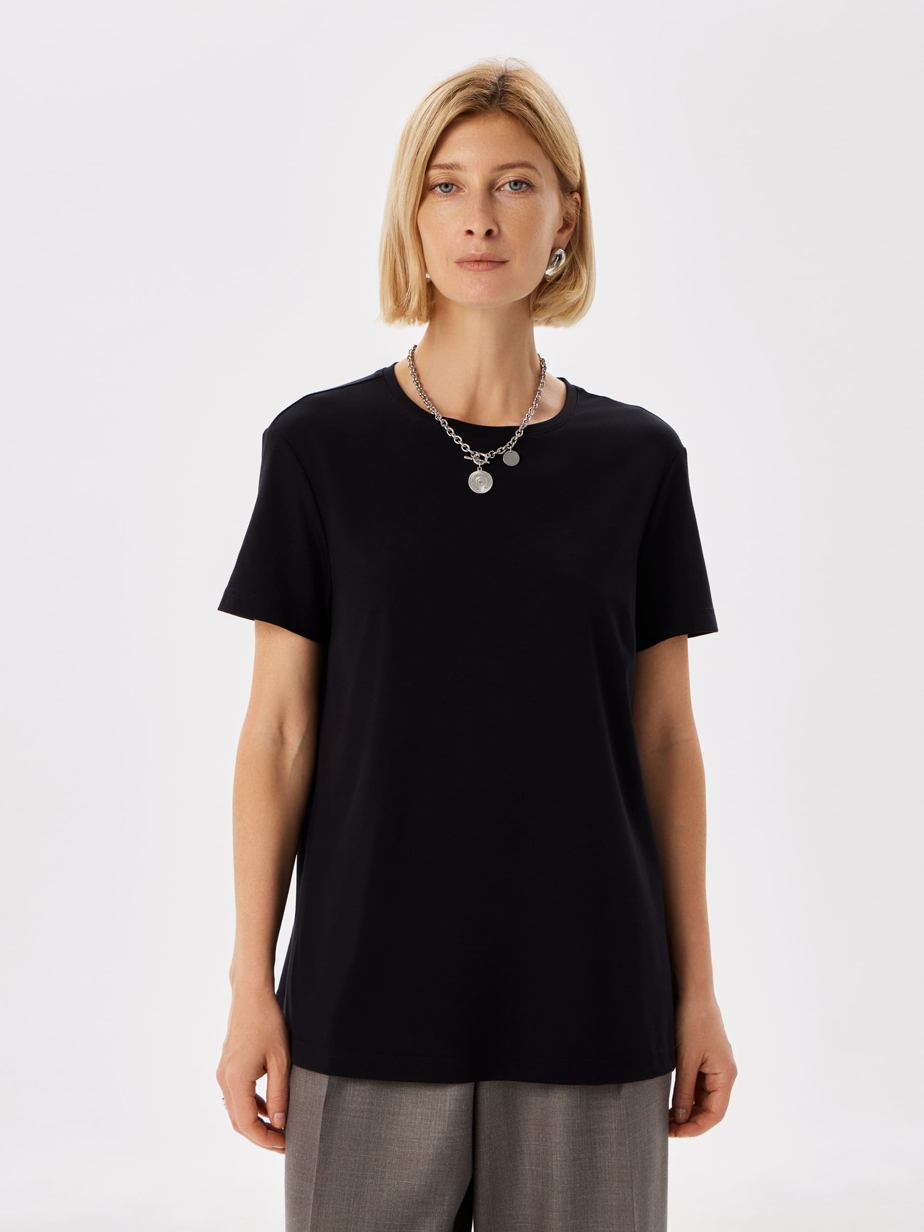 Цвет: Черный Рисунок: Без рисунка..показать Состав: 60%вискоза 31%нейлон 9%эластан Модель: Прямая Ворот: Круглый Караман: отсутствует Силуэт: Прямой силуэт / Сlassic fit