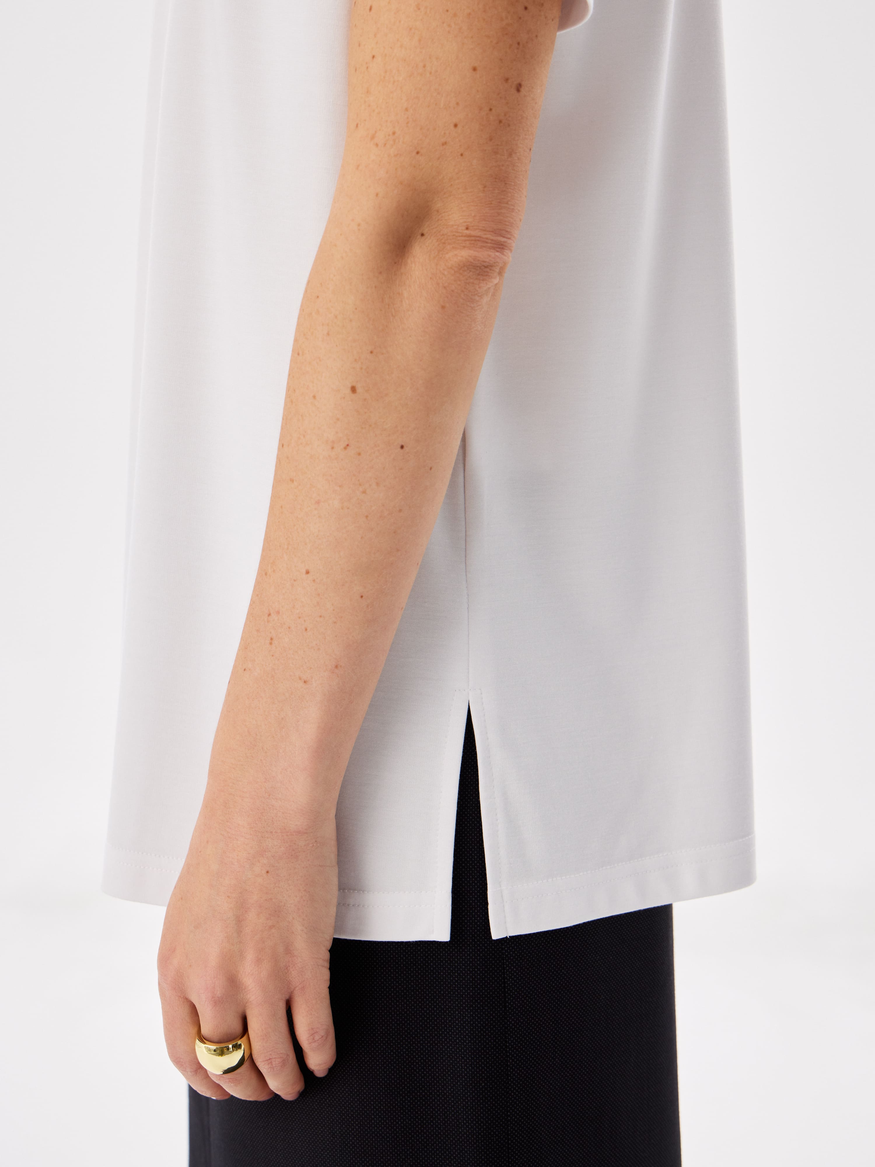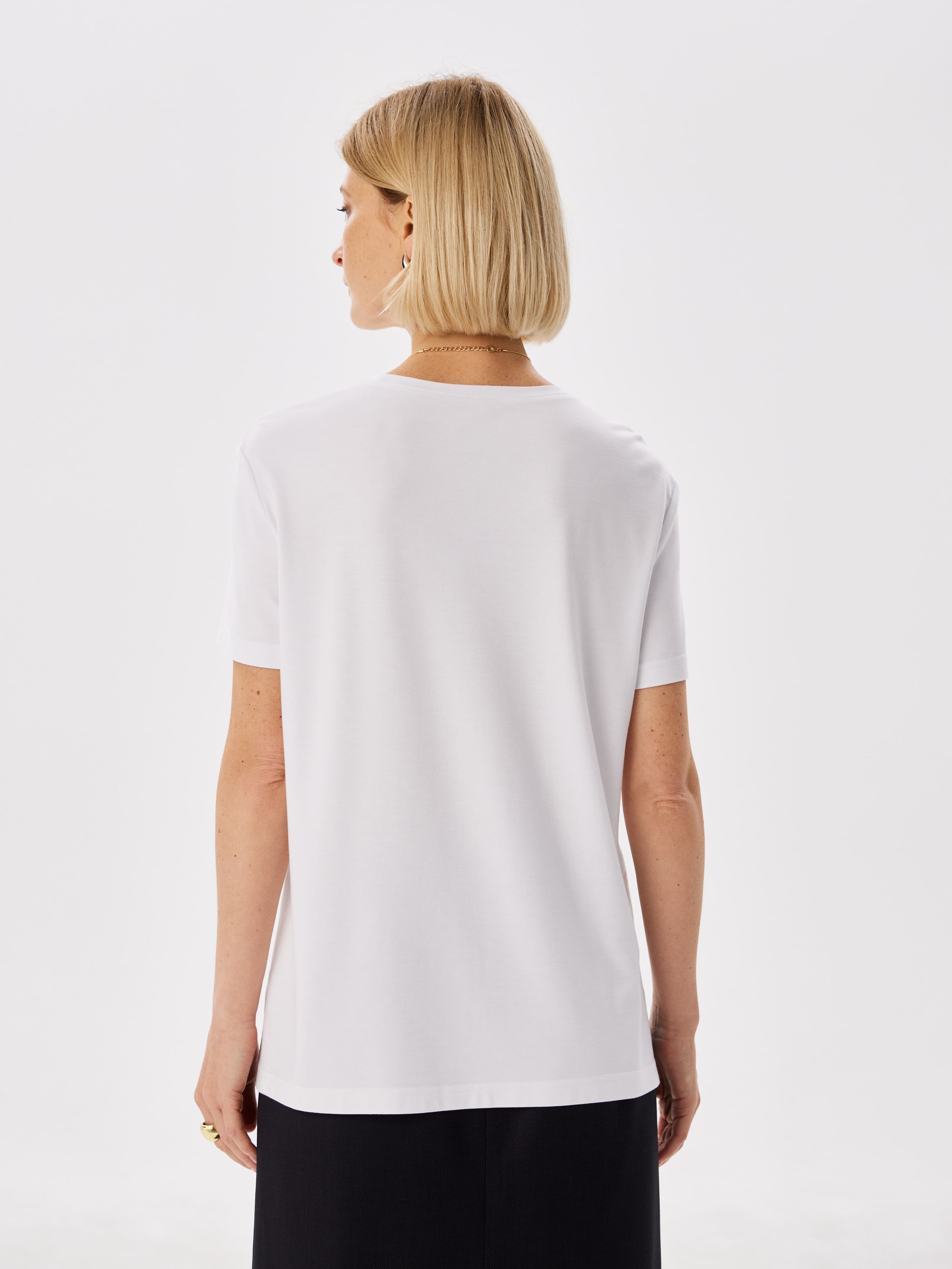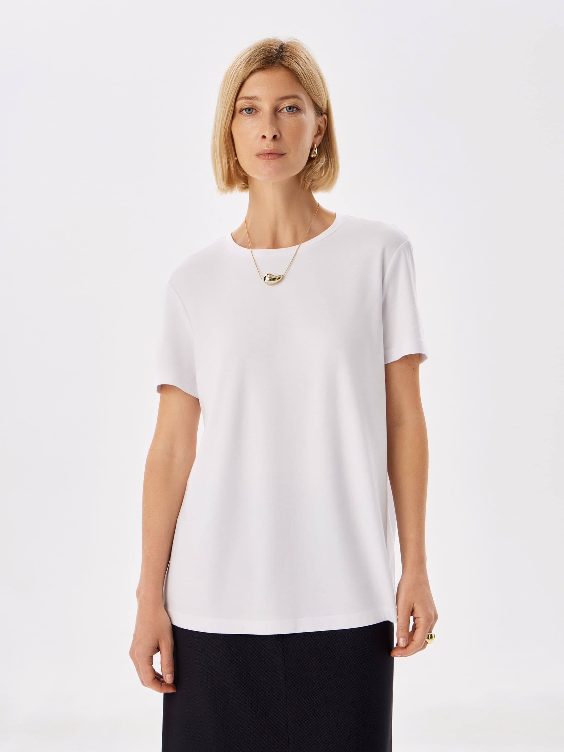 Цвет: Белый Рисунок: Без рисунка<..показать/li> Состав: 60%вискоза 31%нейлон 9%эластан Модель: Прямая Ворот: Круглый Караман: отсутствует Силуэт: Прямой силуэт / Сlassic fit/li>