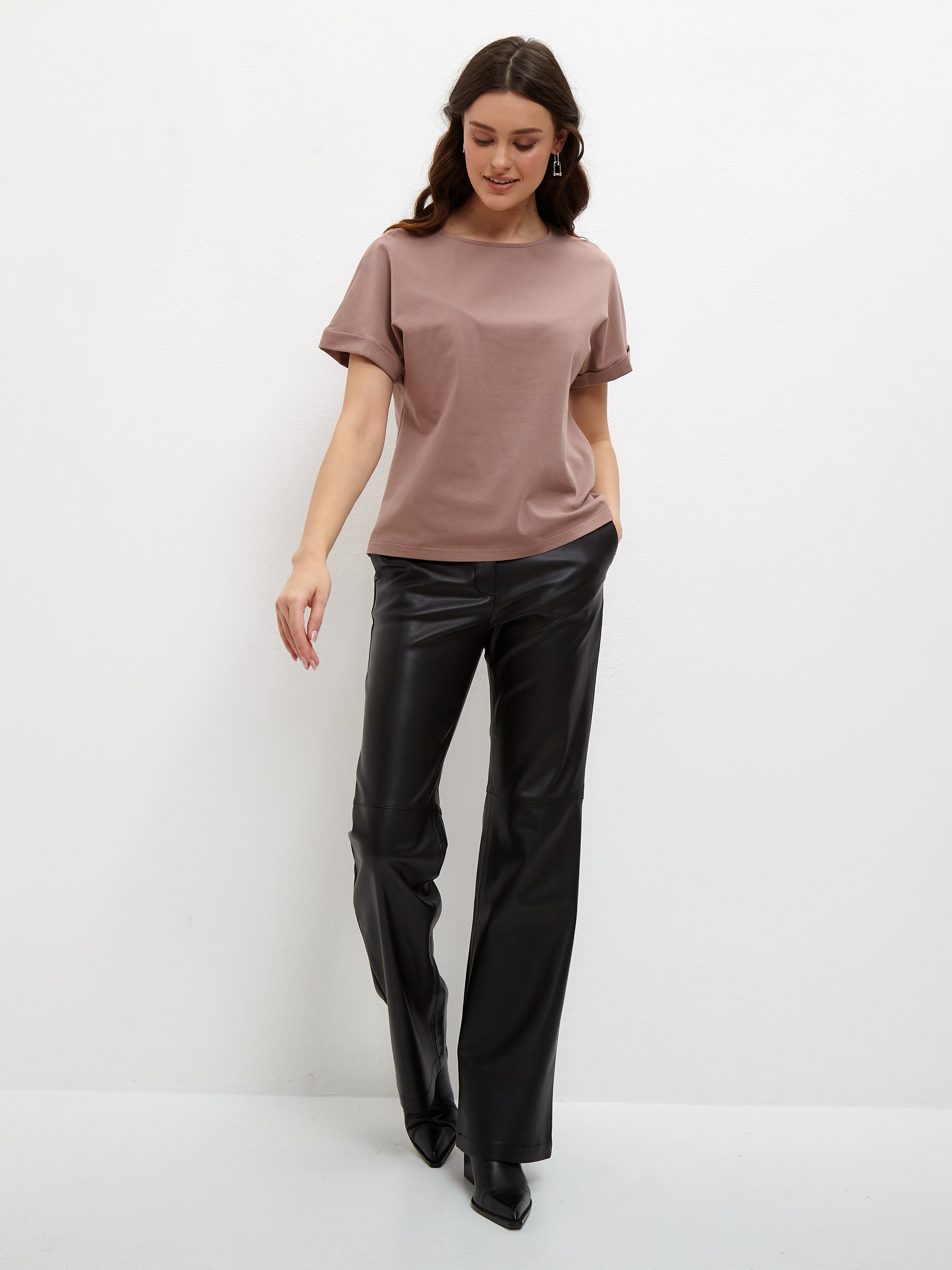 Цвет: Коричневый Рисунок: Без рис..показатьунка Состав: 95% хлопок 5% эластан Модель: Прямая Ворот: Круглый Силуэт: Прямой силуэт / Сlassic fitунка