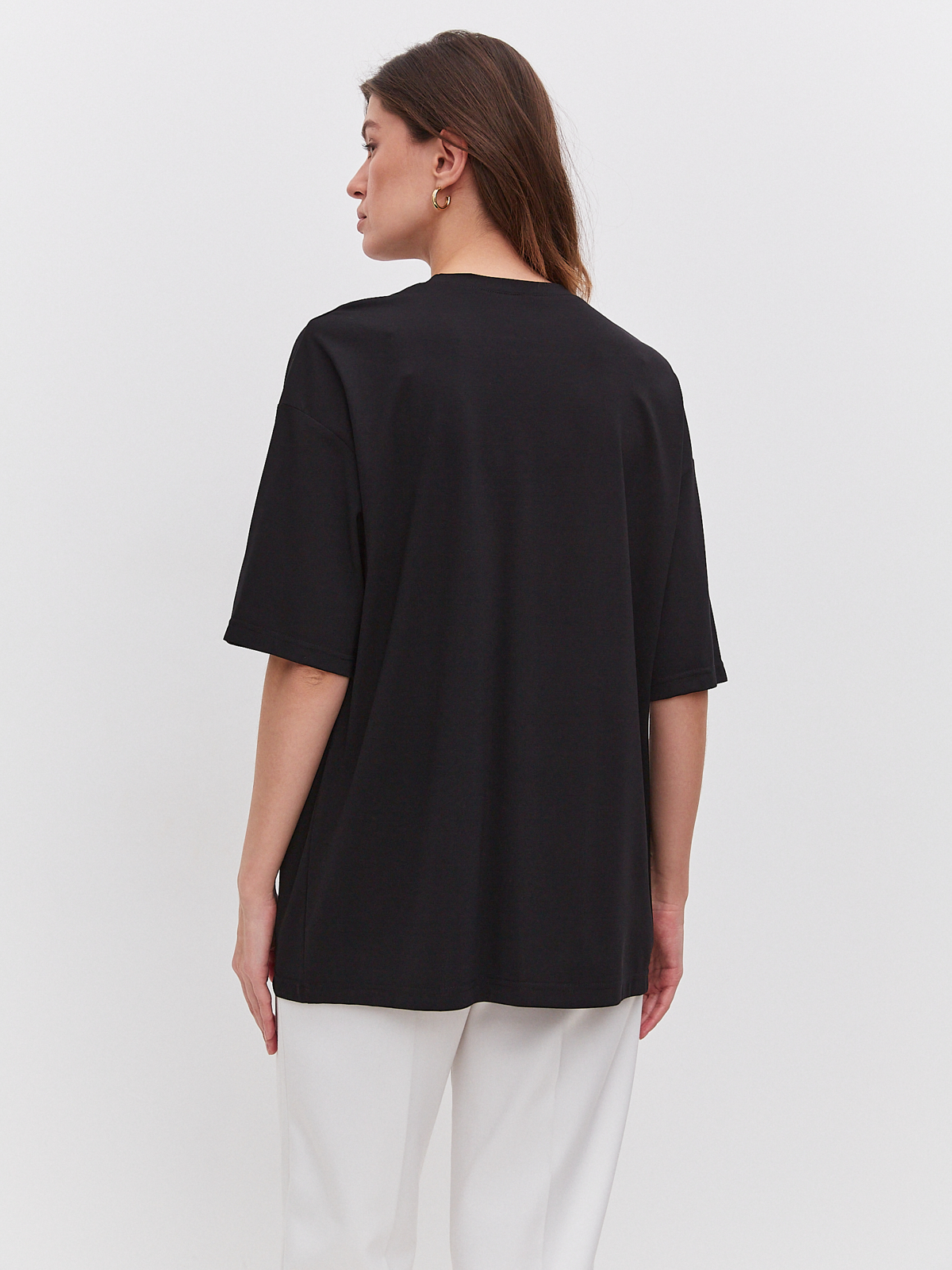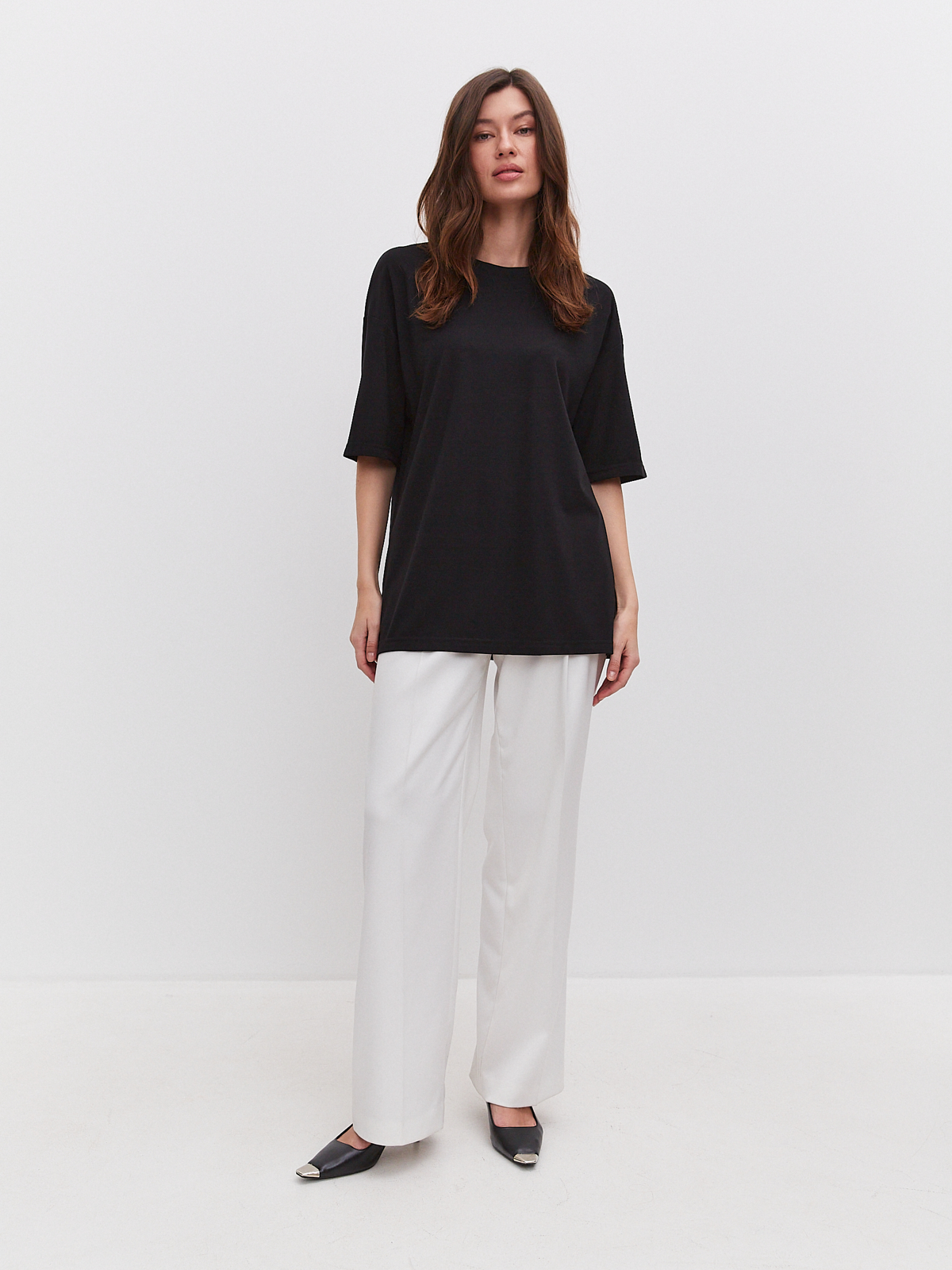 Цвет: Черный Рисунок: Без рисунка..показать Состав: 60%вискоза 31%нейлон 9%эластан Модель: Оверсайз Ворот: Круглый Силуэт: Свободный силуэт / Оversize