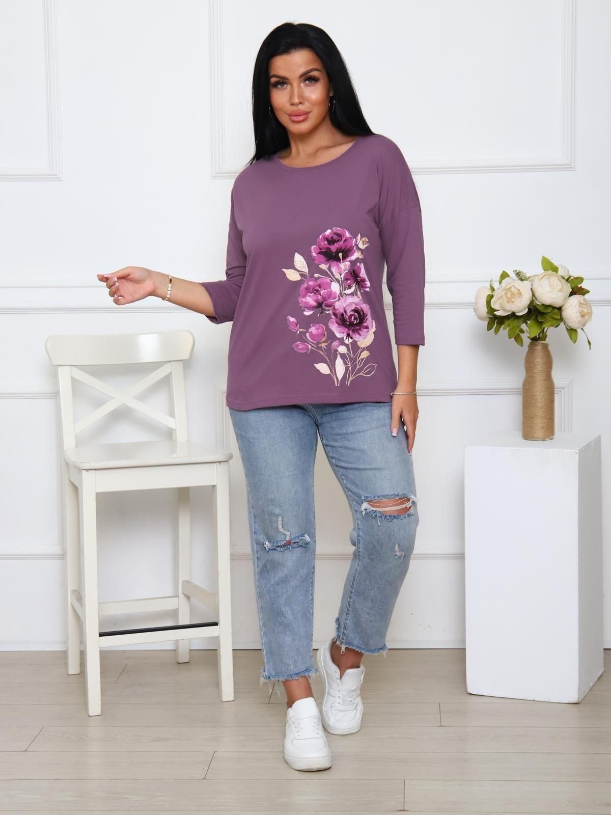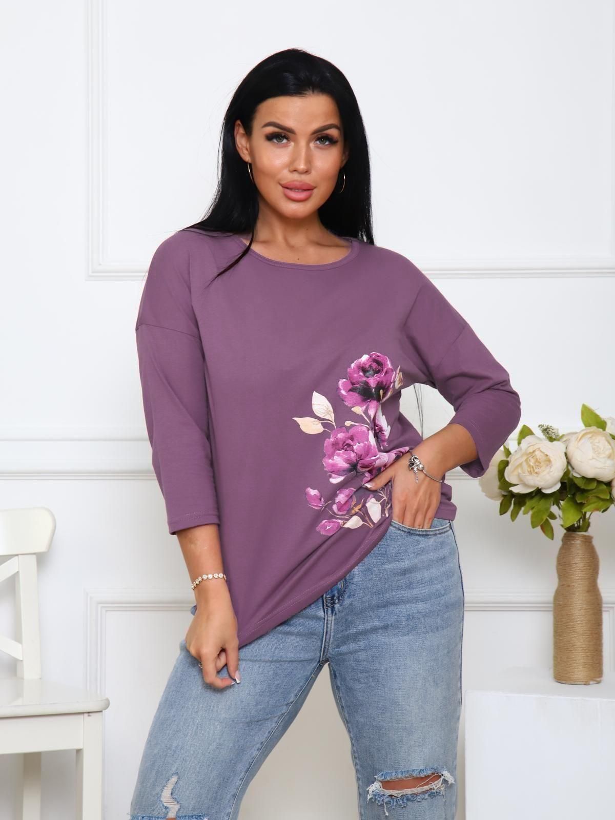 Футболка женская с принтом цветы, из натурального трикотажа.  Отличный вариант одежды, который позволяет скрыть все недостатки фигуры и подчеркнуть достоинства. Мягкие линии  делают эту модель очень женственной.  Горловина круглой формы. Полуприлегающий силуэт,  рукав три четверти.  Принт нанесен непосредственно в ткань футболки - не наклейка. Цветочный принт выделит Вас среди других девушек.