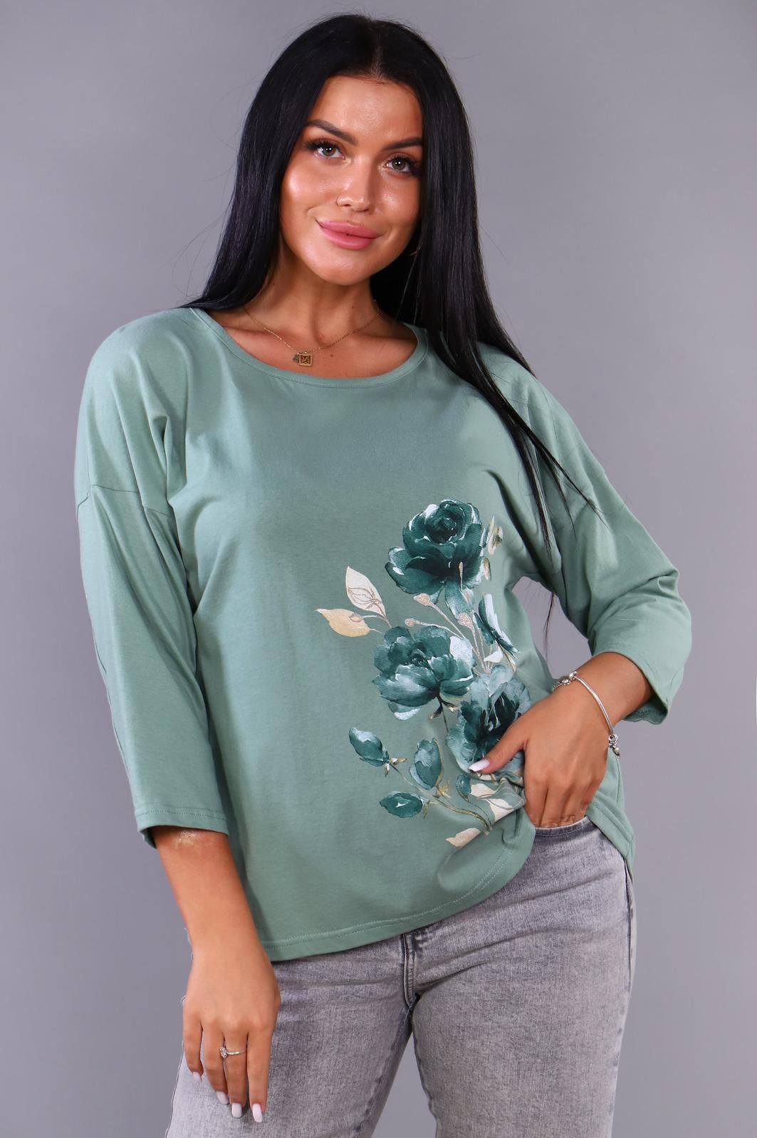 Футболка женская с принтом цветы, из натурального трикотажа.  Отличный вариант одежды, который позволяет скрыть все недостатки фигуры и подчеркнуть достоинства. Мягкие линии  делают эту модель очень женственной.  Горловина круглой формы. Полуприлегающий силуэт,  рукав три четверти.  Принт нанесен непосредственно в ткань футболки - не наклейка. Цветочный принт выделит Вас среди других девушек.