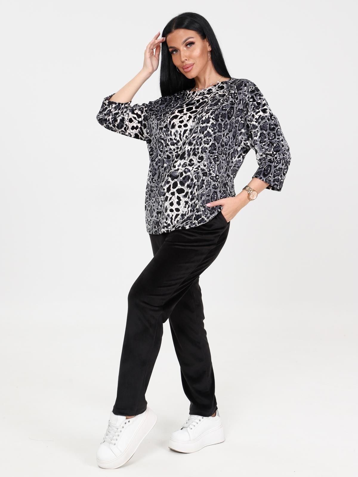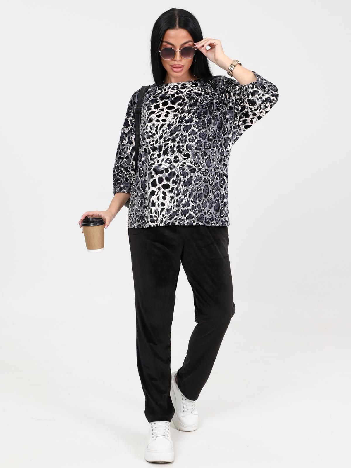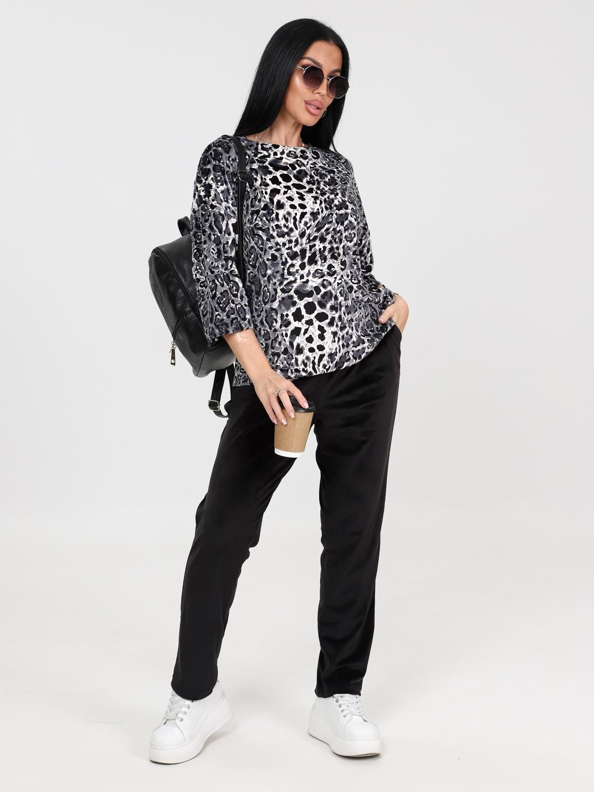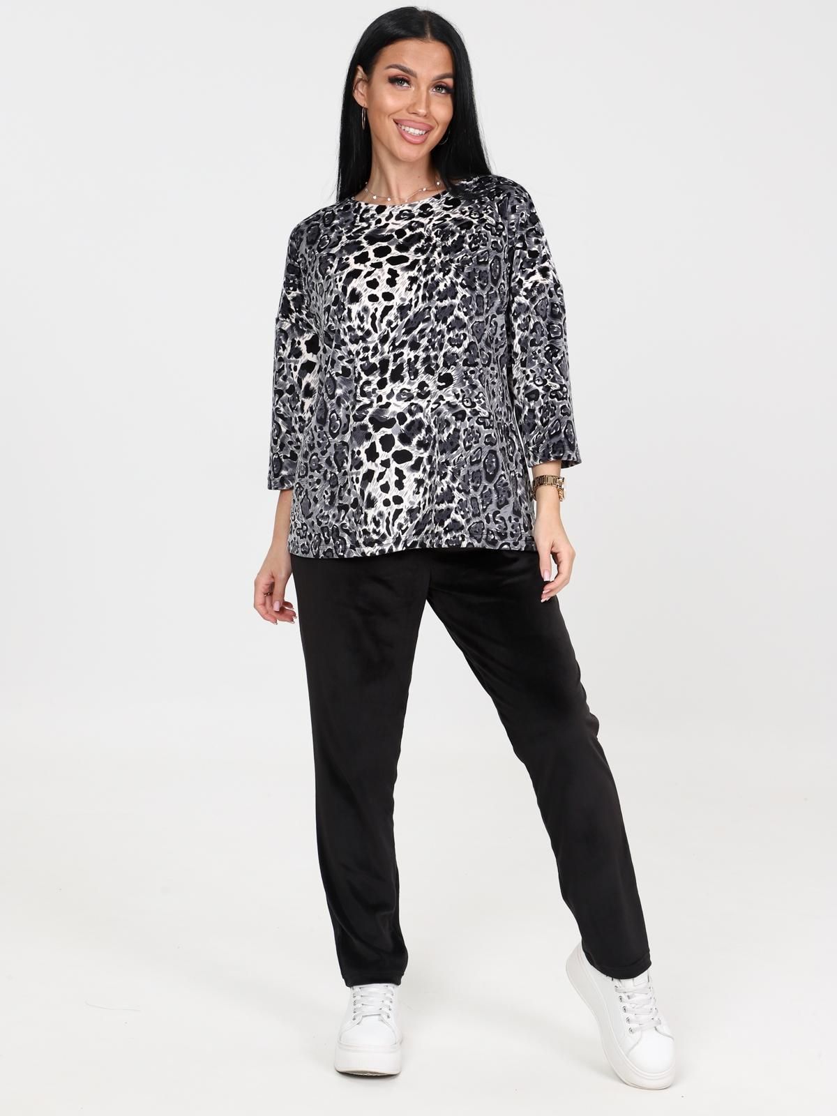 Женский трикотажный костюм состоит из кофты и брюк. Кофта прямого силуэта со спущенной линией плеча. Рукав 3/4. Брюки с карманами в боковых швах, верх на эластичной тесьме.