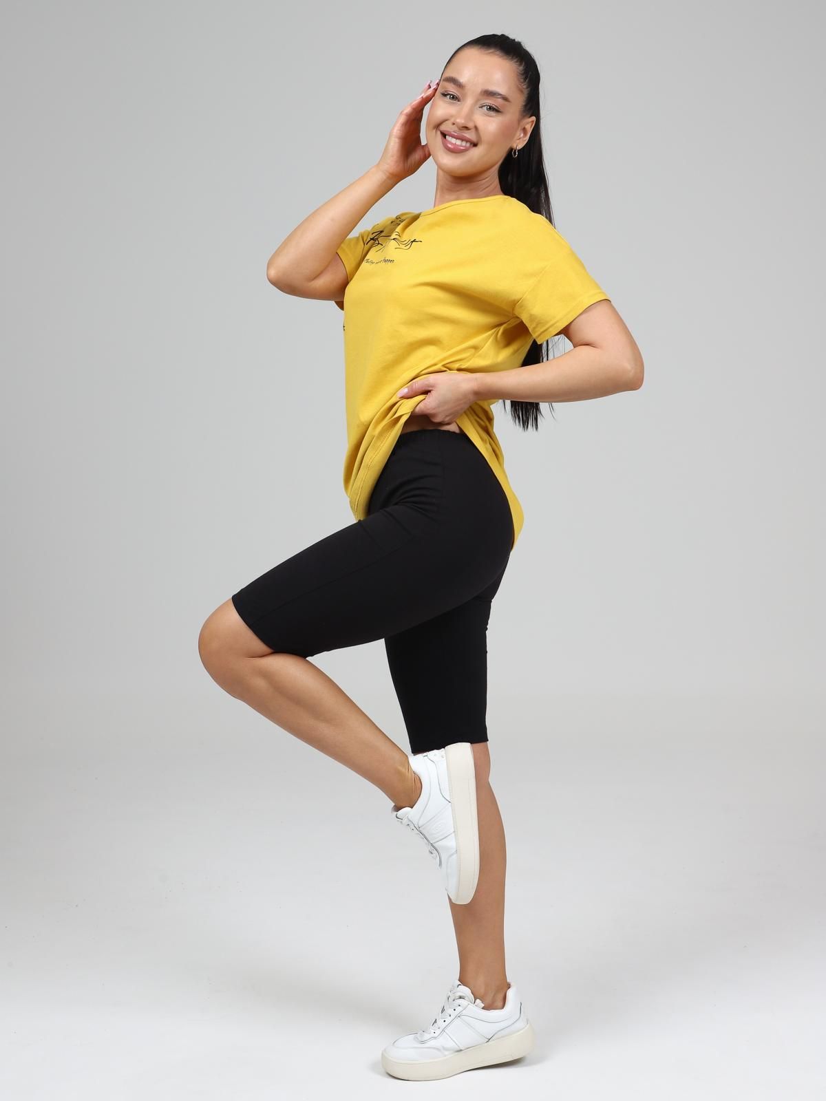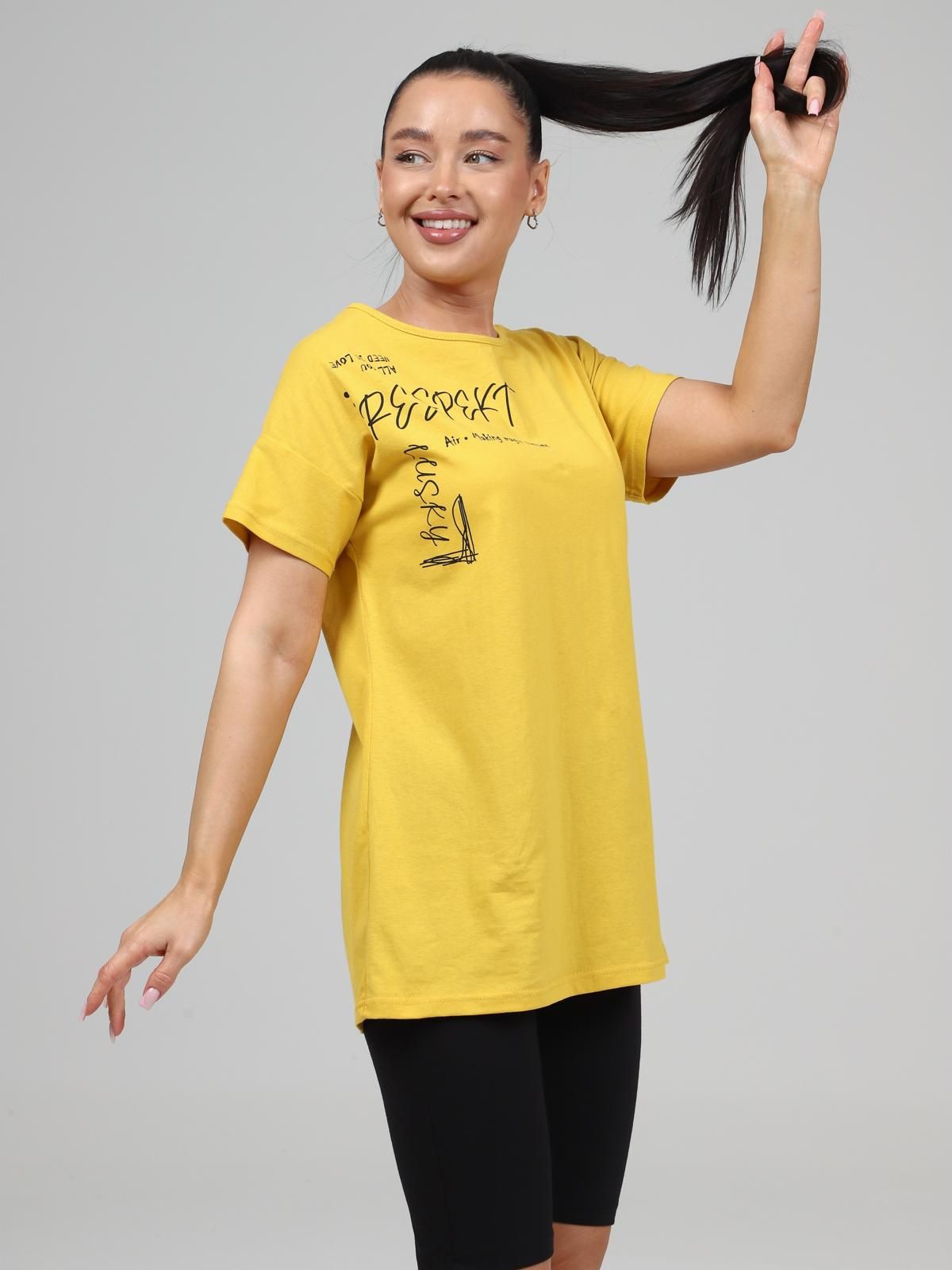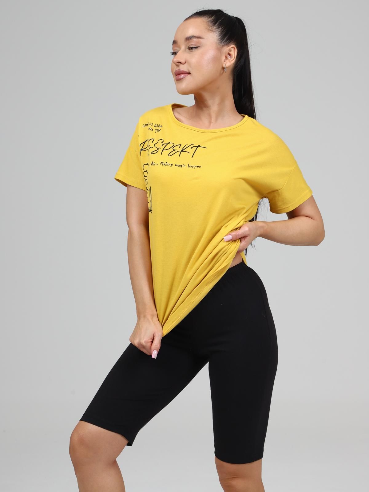Женский комплект состоит из футболки и  шорт "велосипедок".Футболка длиной до бёдер свободного силуэта с коротким рукавом и принтом на полочке. Шорты облегающие