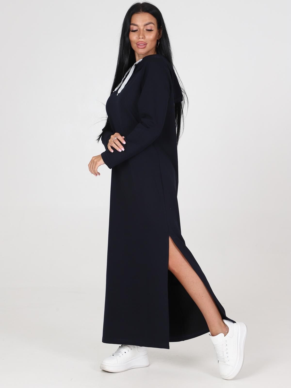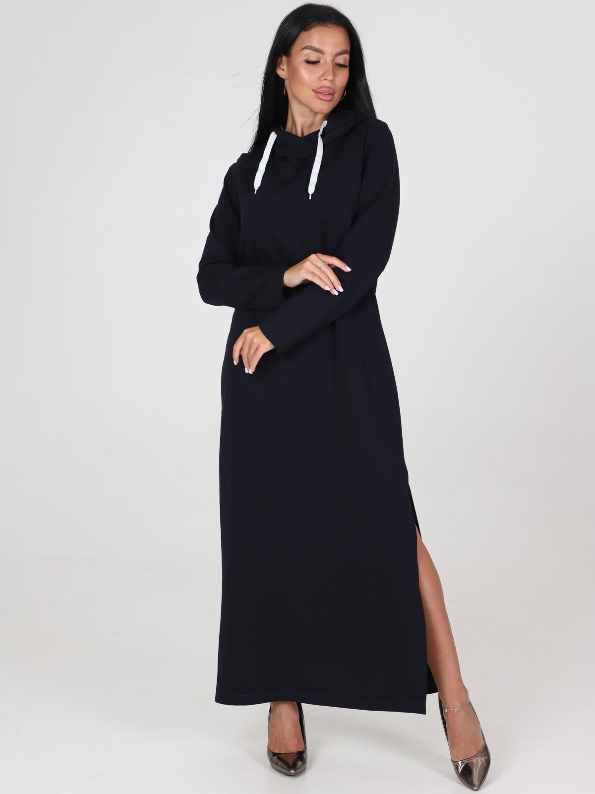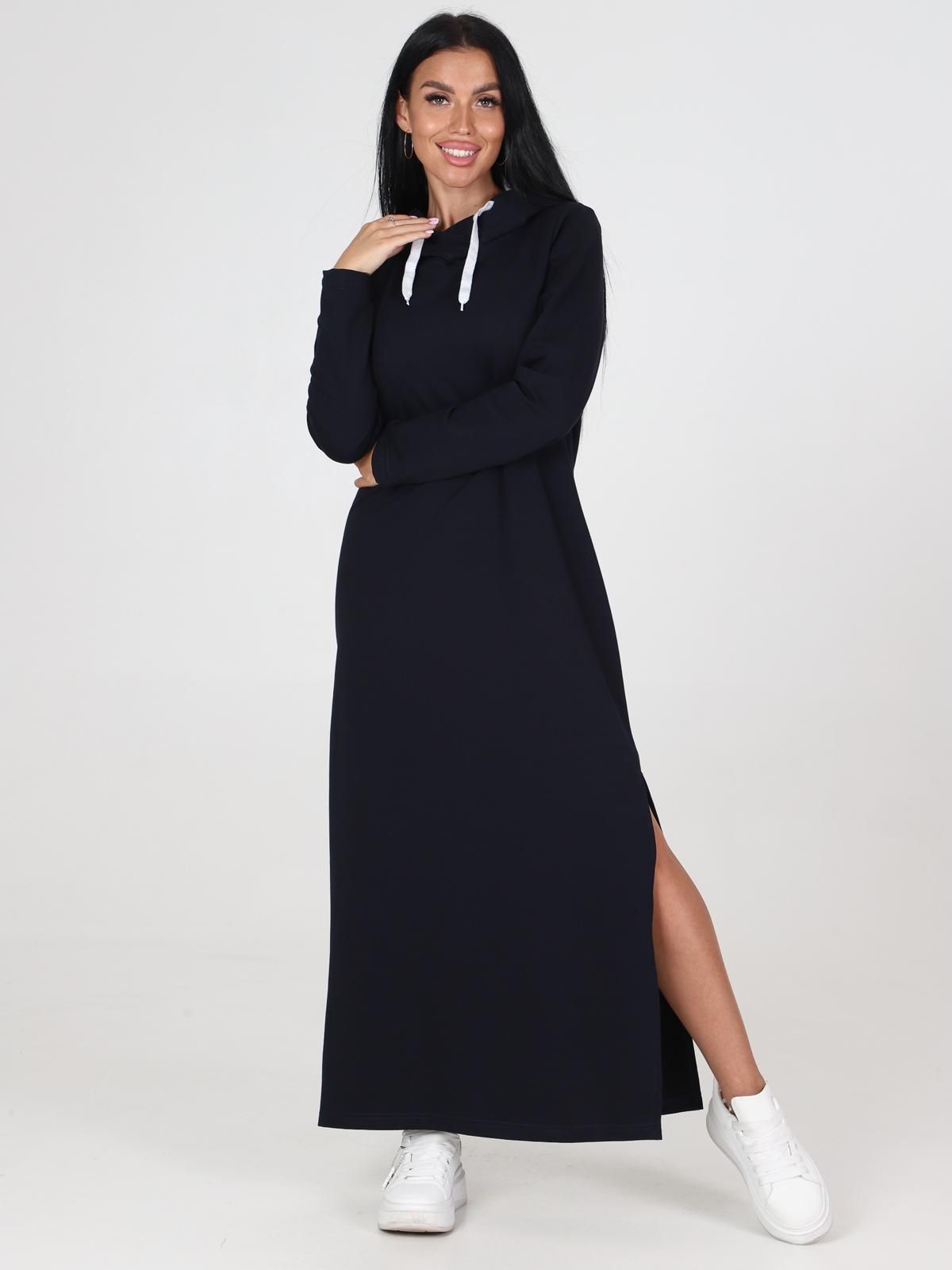 Стильное, современное и необычное платье из футера! Практичное платье-туника актуальной длины (миди) будет прекрасным вариантом для вашего повседневного гардероба. Прямой силуэт, длинный рукав, удобный капюшон.  Для удобства движения на платье есть разрез. Стильное, беспроигрышное решение для городских будней.