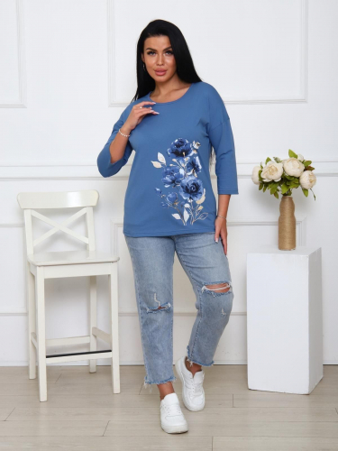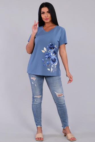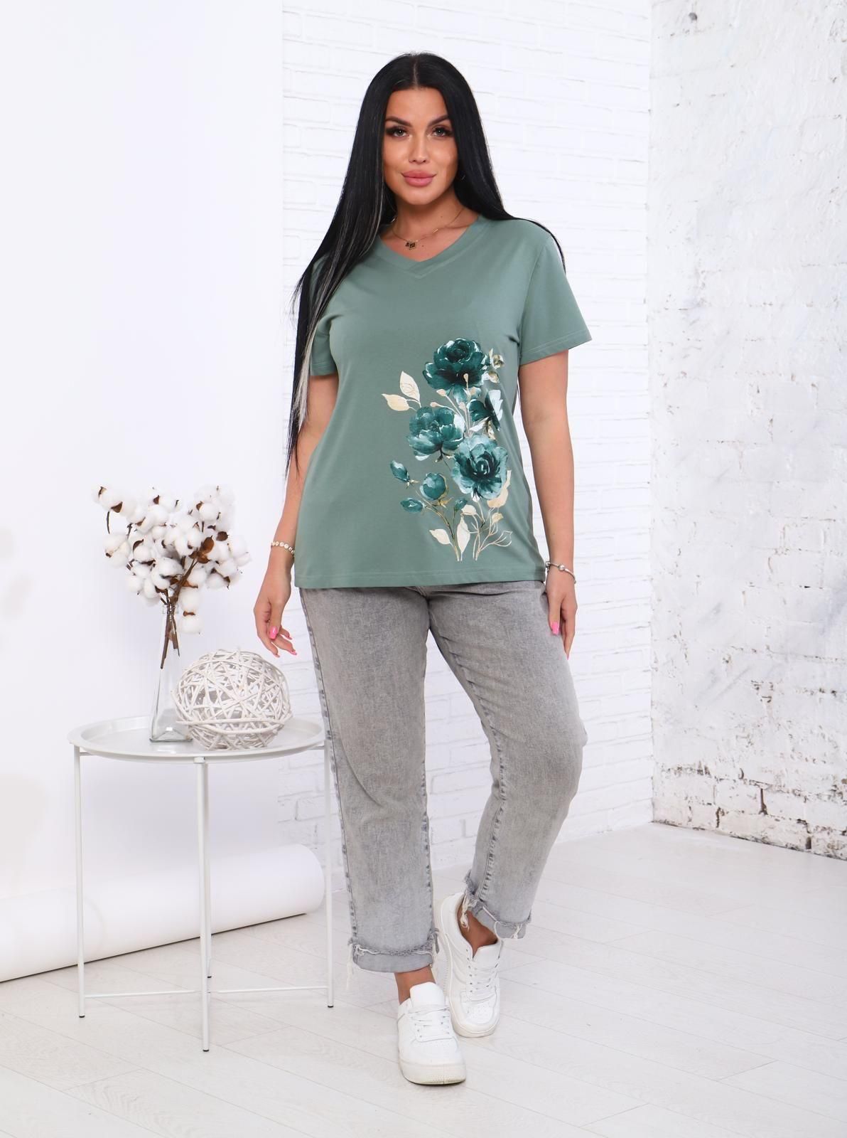Футболка женская с принтом цветы, из натурального трикотажа.  Отличный вариант одежды, который позволяет скрыть все недостатки фигуры и подчеркнуть достоинства. Мягкие линии полуприлегающего силуэта делают эту модель очень женственной.  Горловина V-образной формы. Полуприлегающий силуэт, небольшой рукав.  Принт нанесен непосредственно в ткань футболки - не наклейка. Цветочный принт выделит Вас среди других девушек.