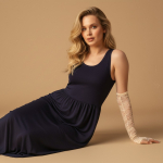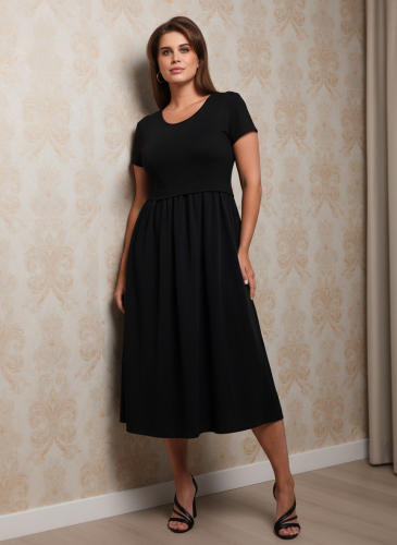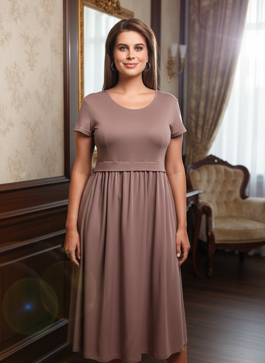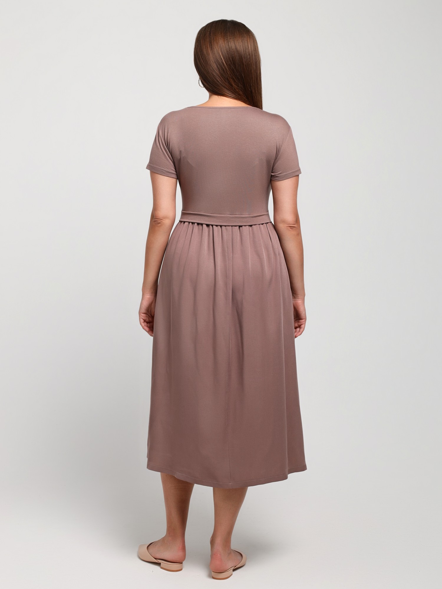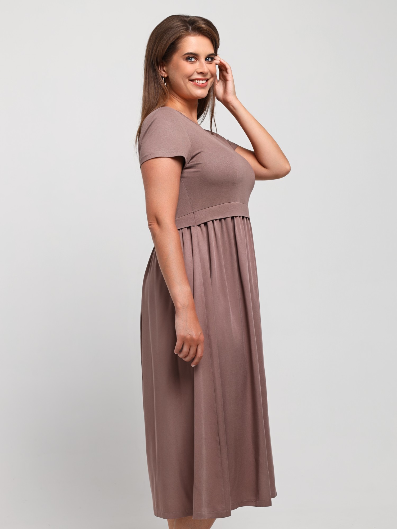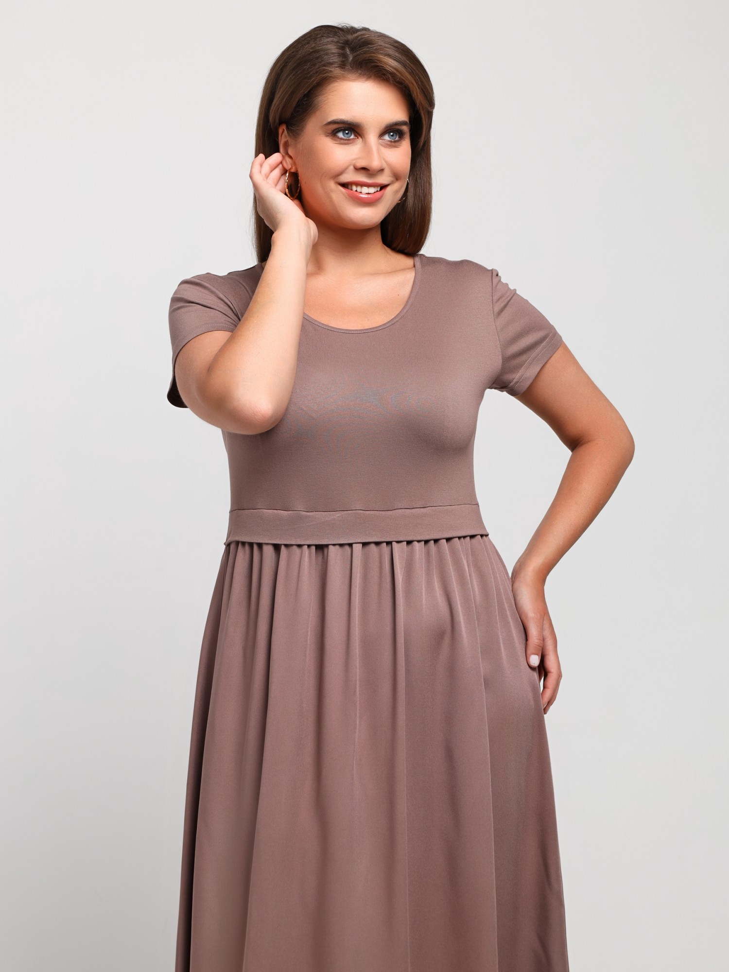 Платье женское отрезное по линии талии в комбинации двух видов гладкокрашеной ткани, в единой цветовой гамме: вискозного полотна (лиф) и плательной штапельной ткани (юбка), удлиненное, с короткими втачными рукавами, горловиной овальной формы, окантованной основным материалом и декоративной планкой в шве соединения лифа с юбкой. Юбка по шву соединения с лифом присборена.