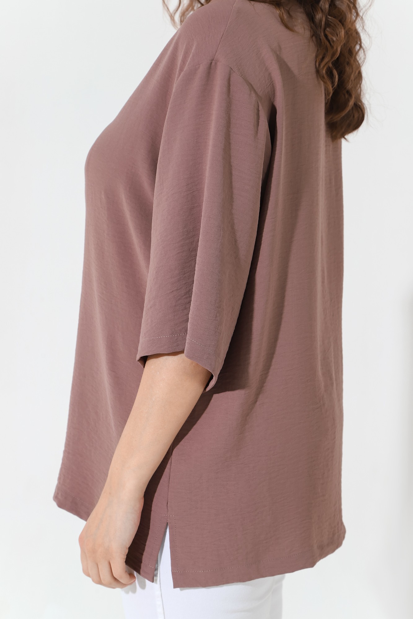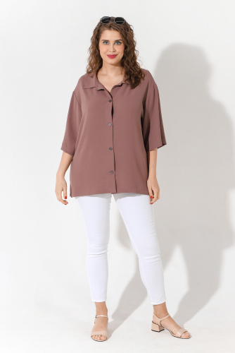 Блуза (рубашка) женская из тканого гладкокрашеного полотна «Лен Манго», свободного покроя, с короткими втачными рукавами, стояче-отложным воротником, центральной бортовой застежкой на обметанные петли и пуговицы. В боковых швах разрезы.