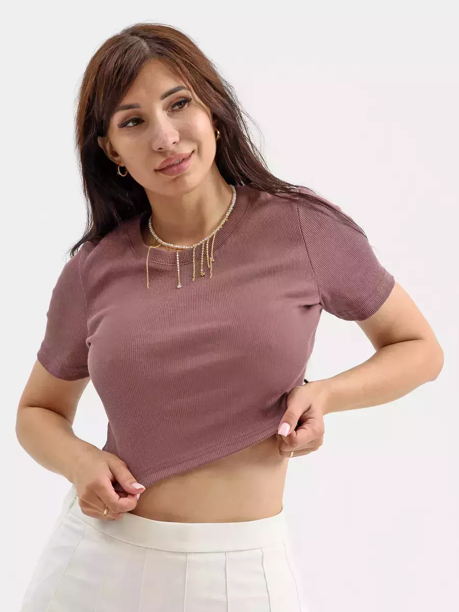 Футболка укороченная женская спортивного стиля, прилегающего силуэта- тренд сезона, выполнена из трикотажного х/б полотна с выработкой «рубчик» . Круглая горловина обработана бейкой из основного материала. Короткий втачной рукав.