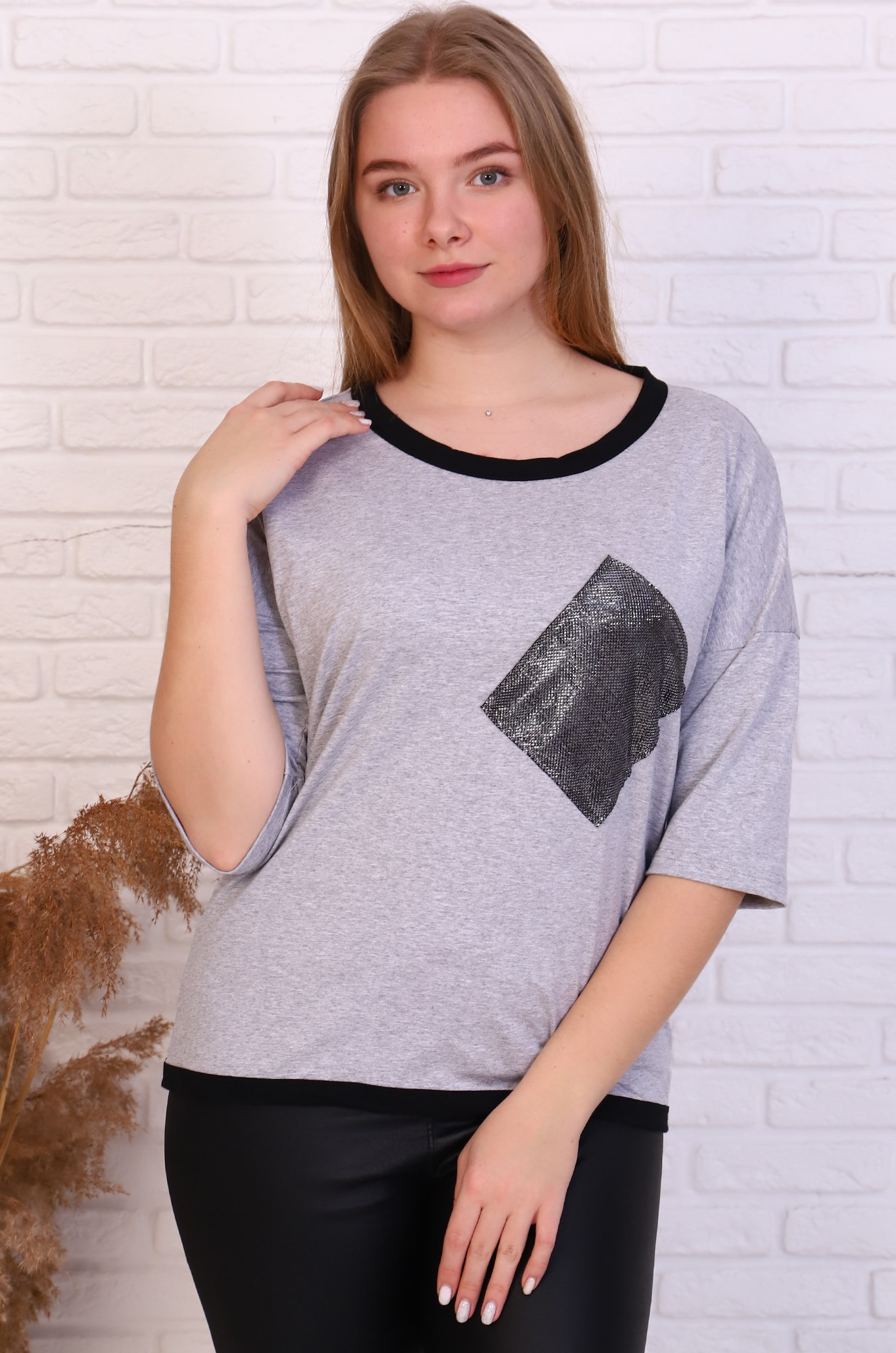 Горловина и низ изделия обработаны контрастным кантом, на груди декоративный блестящий элемент в виде кармана.
