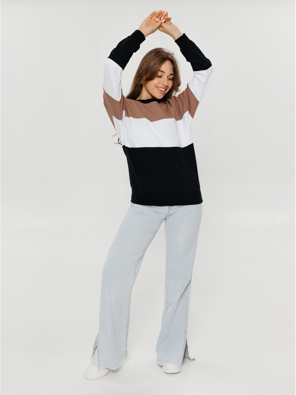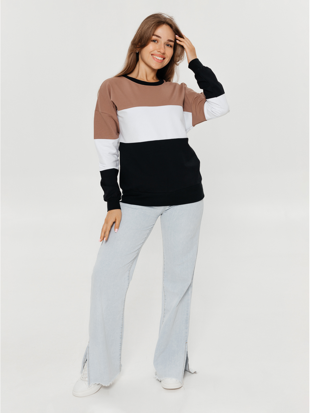 Модель кофты простого кроя из трикотажного полотна, в которой всегда можно выглядеть модно, а при необходимости и согреться.