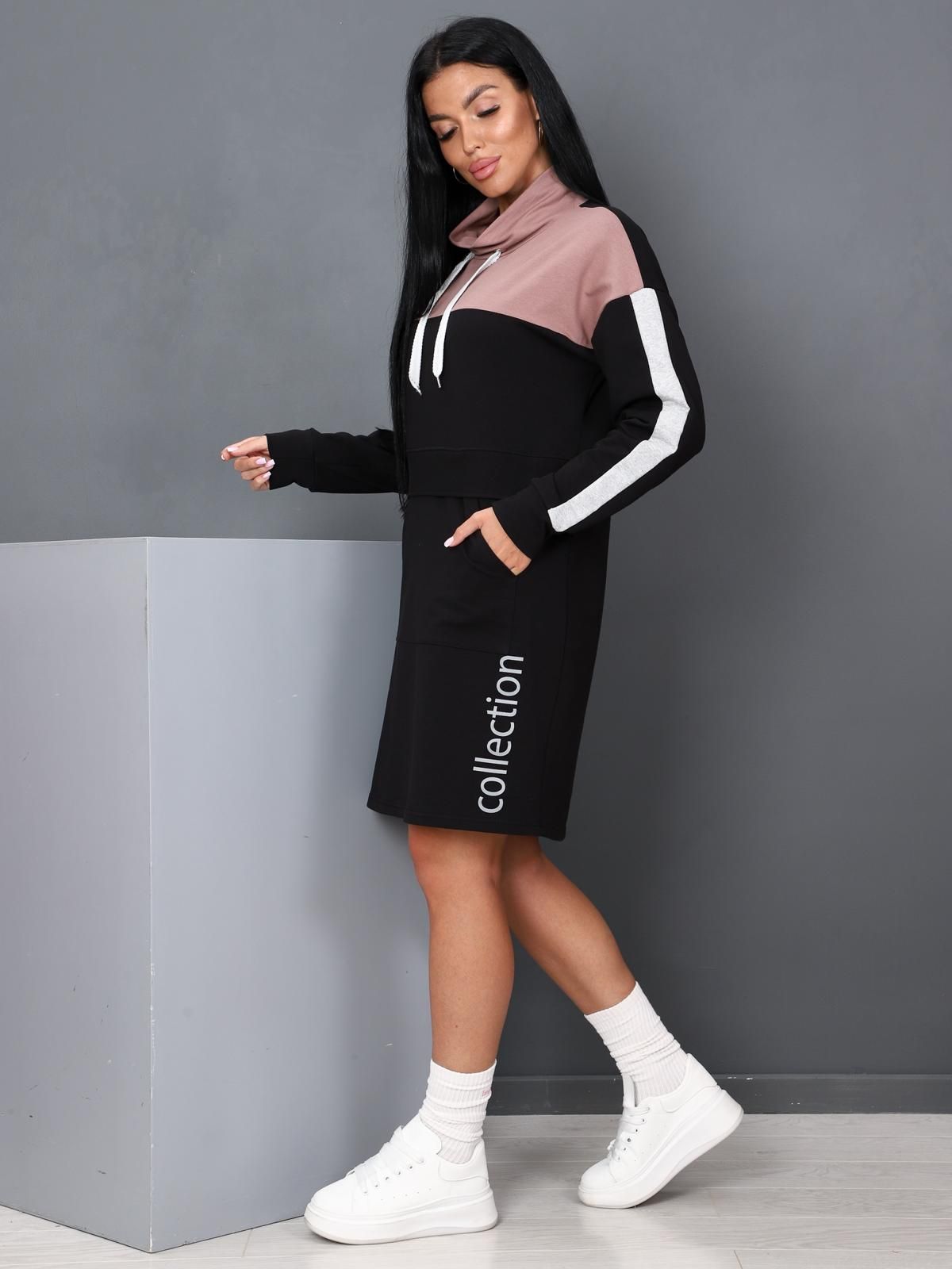 Платье  женское прямого силуэта в спортивном стиле. Воротник-стойка регулируется шнуром. На полочке отделочная планка и карман "кенгуру". По боковому шву-печать. Длинный рукав с лампасами на манжете.