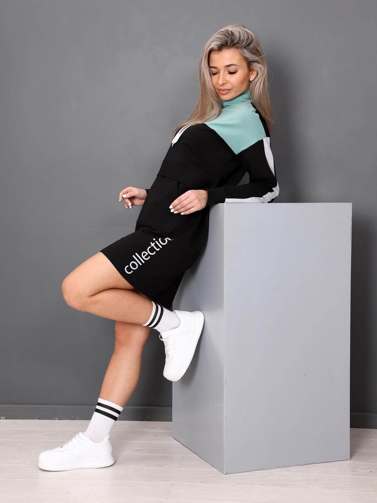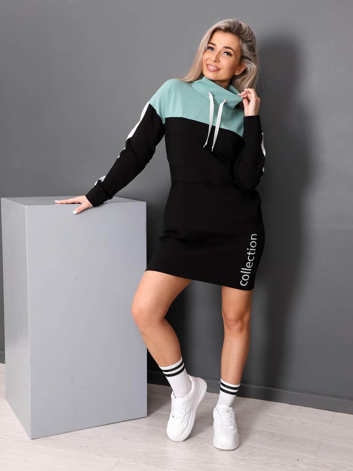 Платье  женское прямого силуэта в спортивном стиле. Воротник-стойка регулируется шнуром. На полочке отделочная планка и карман "кенгуру". По боковому шву-печать. Длинный рукав с лампасами на манжете.