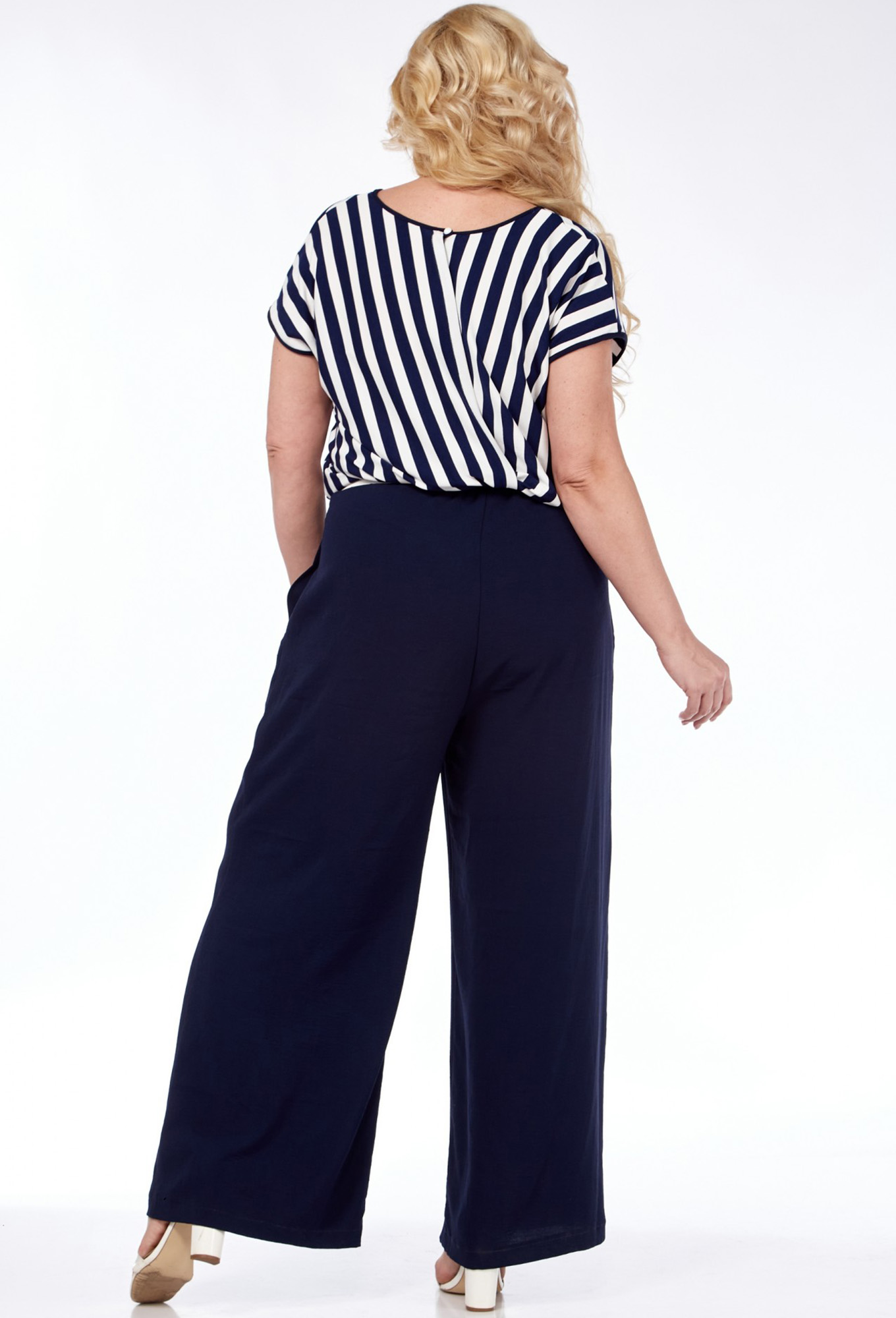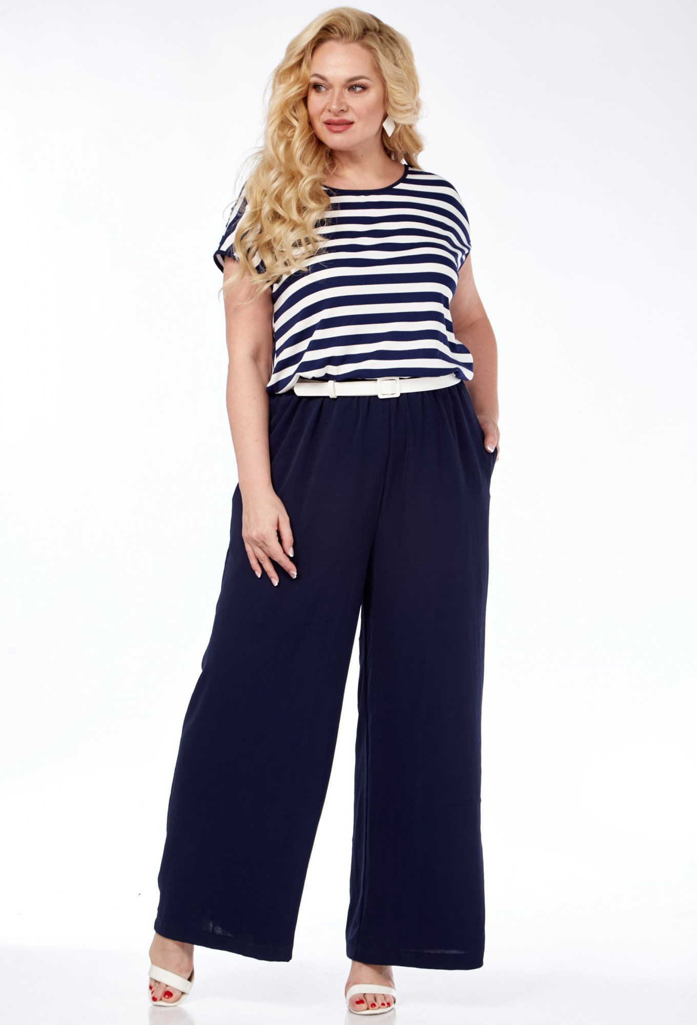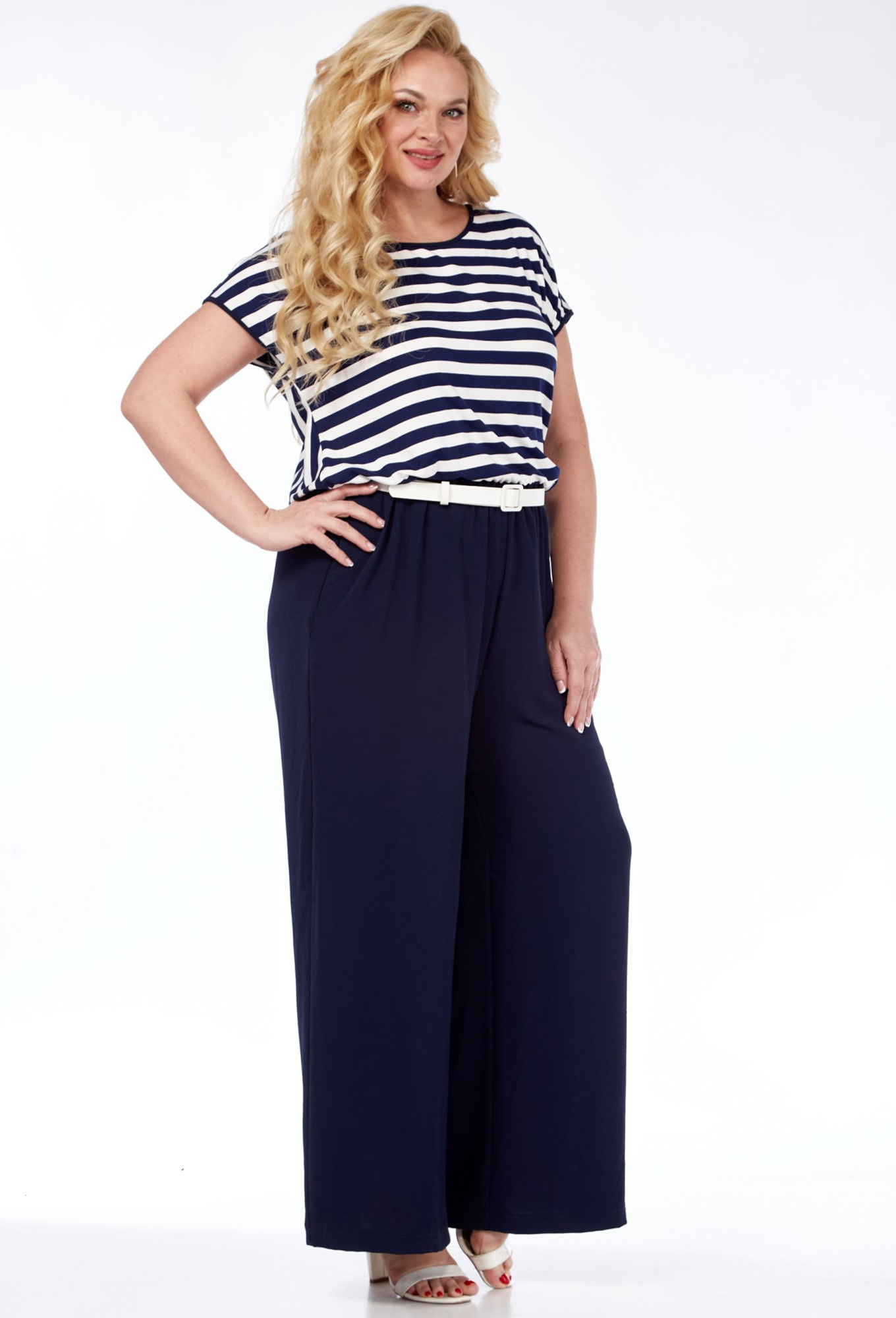 Модель: Диамант 1975 т.синий Рост..показать: 164 см (девушка на фото ростом 170см) Сезон: Весна-Лето Тип ткани: ПЭ 62%, вискоза 38%Комбинезон женский( выполнен из двух видов ткани) свободного кроя с застежкой на 1 навесную петлю и пуговицу на горловине спинки. Лиф из трикотажа в полоску с запахом на спинке. Горловина округлой формы. Нижняя часть комбинезона с притачным поясом и резинкой. В боковых швах обработаны карманы. Ремень входит в комплект.