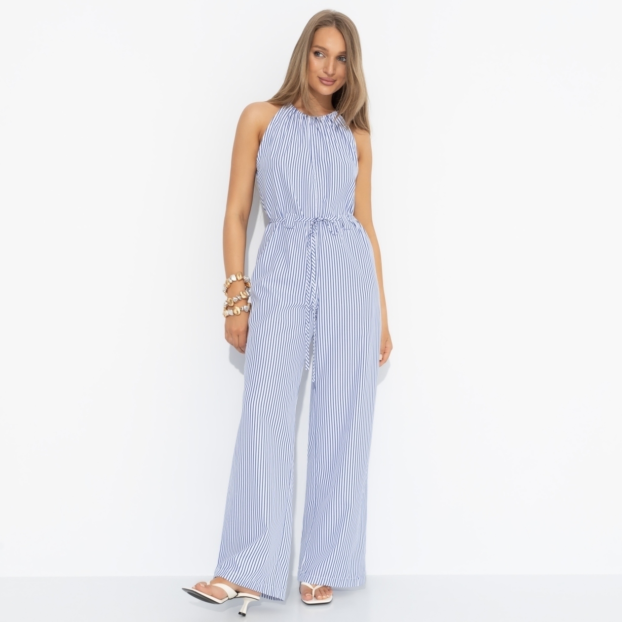 Отправиться в круиз? Почему бы и да?! Активный и роскошный отдых на огромном теплоходе или на лаконичной яхте. Ты готова к разным вариантам, главное, что комбинезон CHARUTTI в тонкую морскую полоску с тобой. Комбинезон с брюками. Акцент на талии – есть шлевки с тонким поясом. Сборочка на шее. Завязки по спинке изделия.