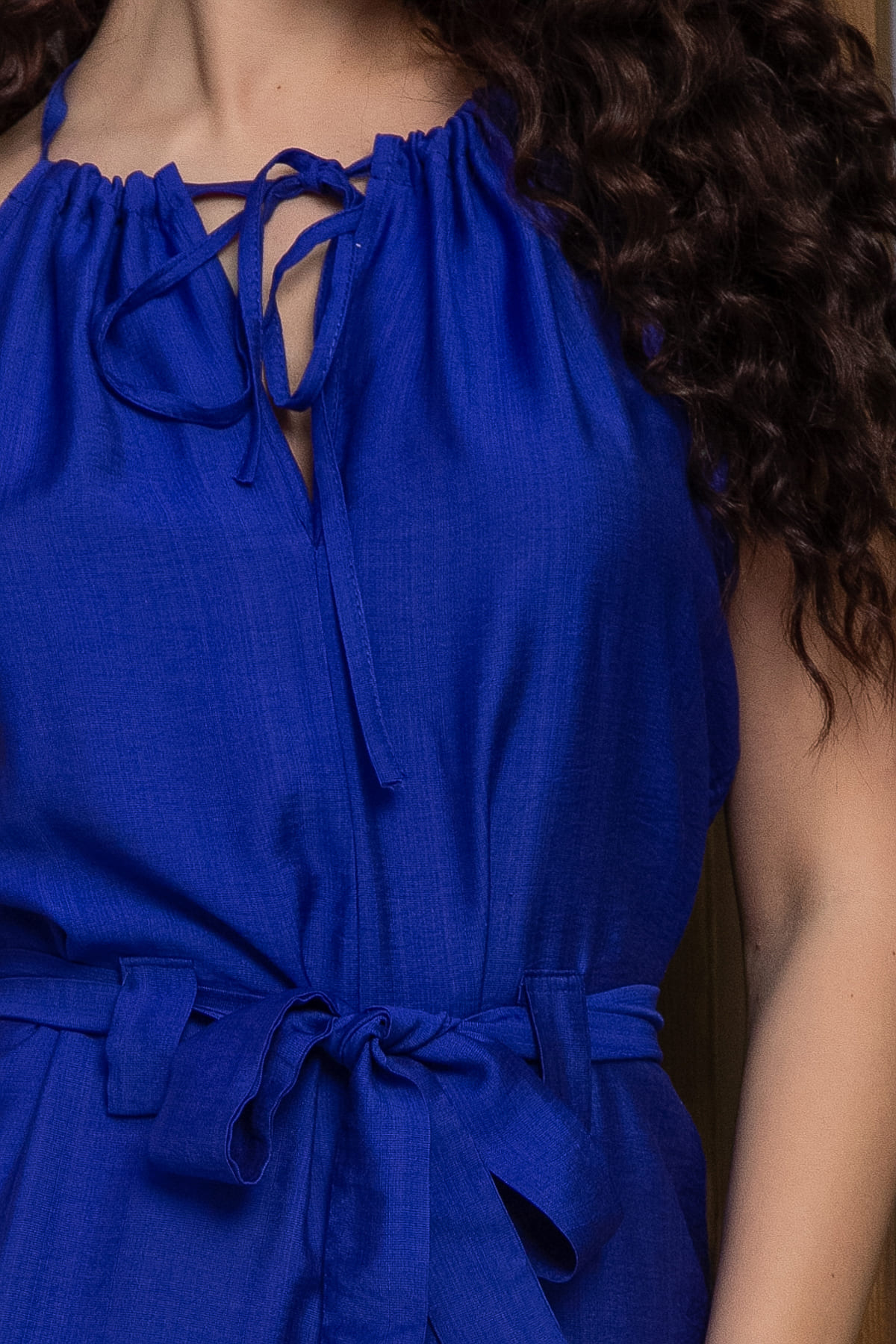 Очаровательный летний комбинезон прямого силуэта с открытыми плечами. Горловина овальной формы с разрезом по среднему шву задней и передней половинок на кулисе, регулирующуюся по длине шнуром. В нижних боковых частях по швам комбинезона высокие разрезы, что придает элегантности и открытия ножек. Объём по линии талии регулируется поясом в шлевках передних и задних половинок.
