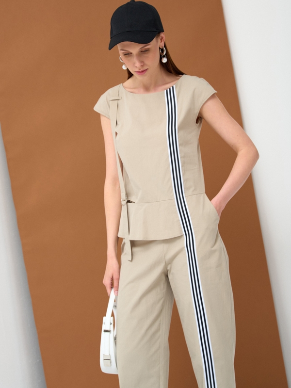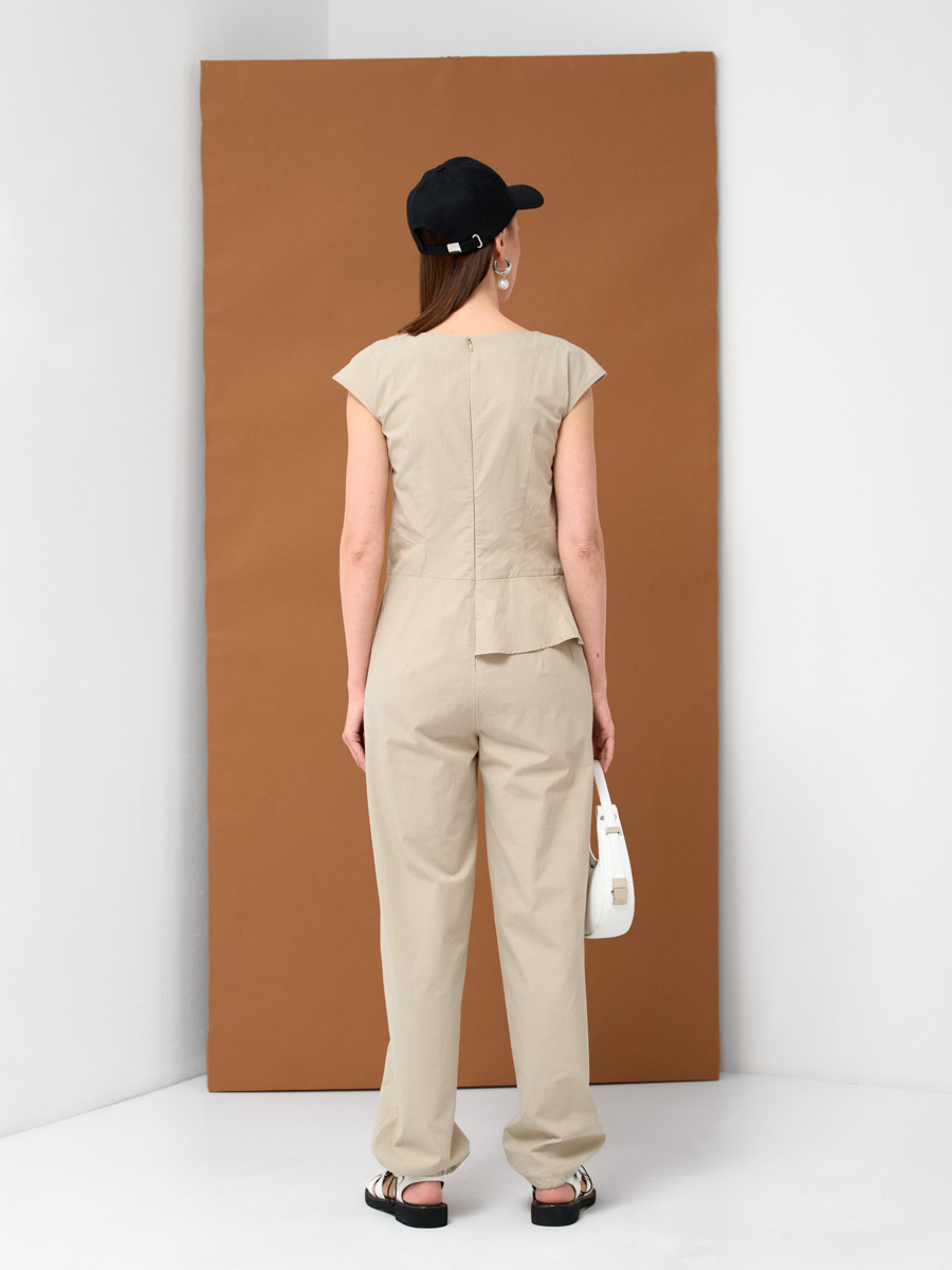 Комбинезон полуприлегающего силуэта из хлопка с баской и застежкой на металлические полукольца, декорированный настроченной тесьмой. В боковых швах брюк расположены два кармана по боковым швам в брюках. Ширина брюк в нижней части регулируется фиксатором. Рост модели на фото 172 см. Размер 42. Машинная деликатная стирка.