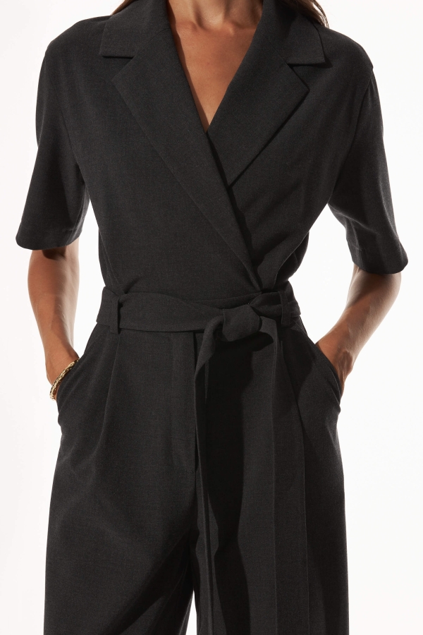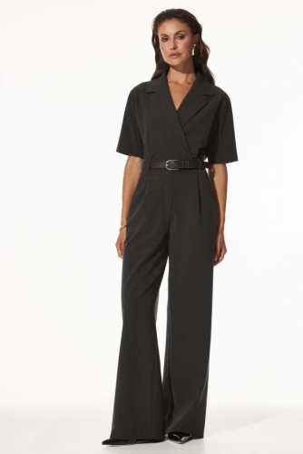 Комбинезон из костюмной поливискозы в графитовом оттенке. Модель приталенная, рукав цельнокроенный укороченный прямой. Воротник английский на запахе. Низ изделия свободный прямой, карманы.