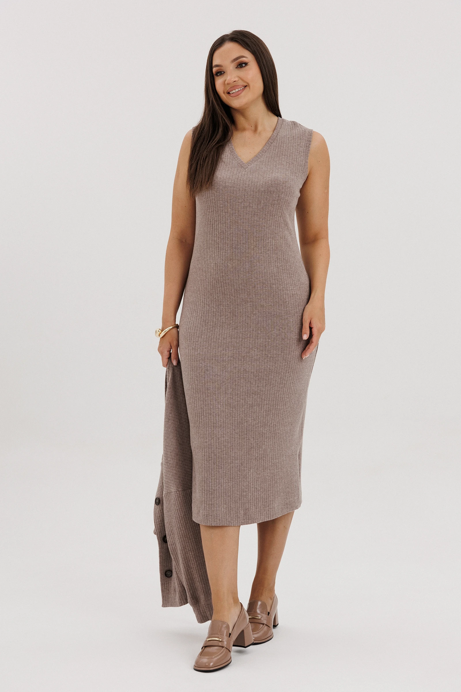 Мягкое, уютное трикотажное полотно в рубчик, платье полуприлегающего силуэта, с V-образным вырезом горловины, без рукава.