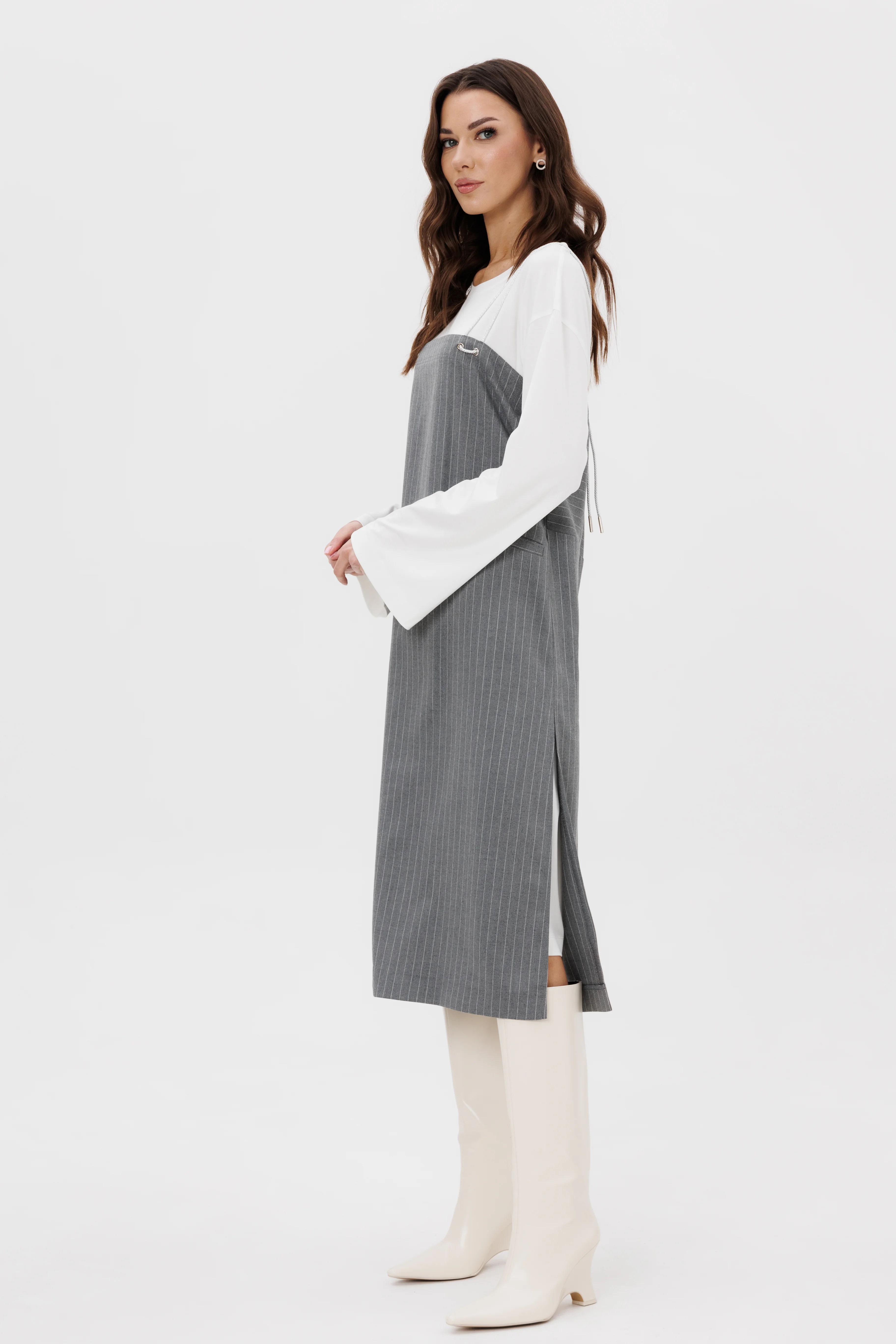 Сарафан длины миди-самая утилитарная вещь осеннего сезона. С ним можно собрать десяток комплектов из базовой одежды, а еще красиво пережить холодный сезон. Восхитительный комплект, в котором первый слой-платье. Оно может быть и самостоятельным вариантом образа, и конечно же идеально под сарафан.
