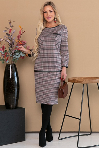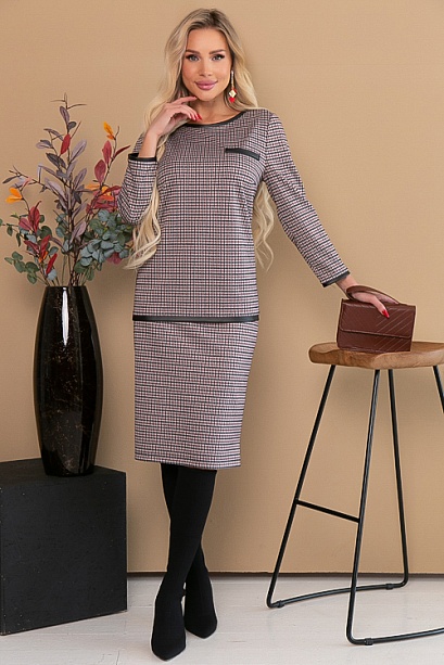Комплект из плотного трикотажа в гусиную лапку.Блузон прямого силуэта с отделкой под кожу.Юбка карандаш с резинкой по талии.