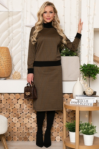 Комплект из жаккардового трикотажа из джемпера и юбки. Джемпер свободного силуэта,горловина,манжеты и пояс-вискозная трикотажная рибана.Юбка А-образного силуэта с эластичной резиной по поясу.