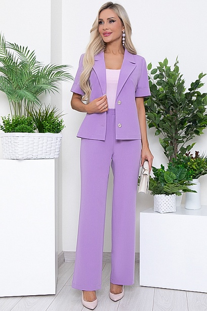 Брючный комплект из комфортной вискозной костюмной ткани. Жакет прямого силуэта с центральной застежкой на две пуговицы.Воротник отложной с лацканами.Брюки свободного прямого силуэта с эластичной резиной по поясу.В боковых швах функциональные карманы.