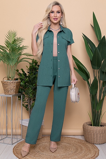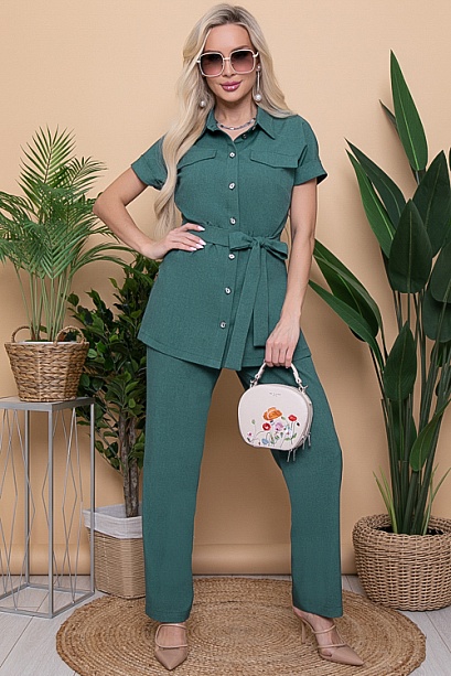 Комплект брючный двух предметный.Брюки с высокой посадкой, прямого силуэта, по поясу эластичная резина,без застежки с имитацией гульфика.Жакет свободного силуэта с центральной застежкой на пуговицы и разрезами в боковых швах.Рукава цельнокроеные с отложной манжетой.Воротник отложной на стойке.Пояс из основной ткани в комплекте.