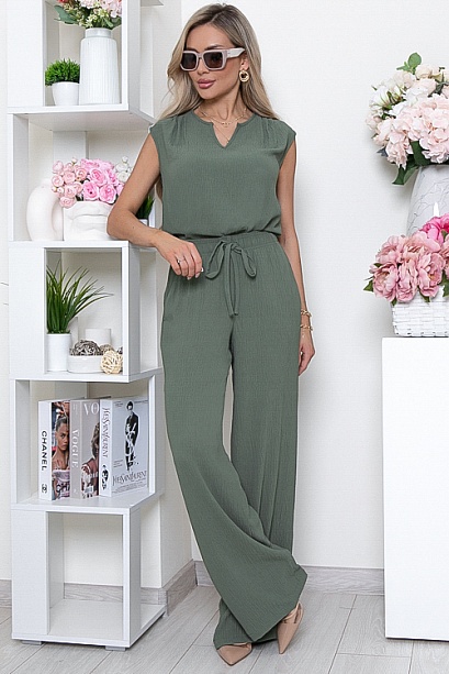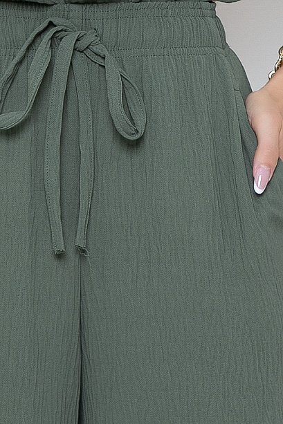 Комплект брючный.Блузка свободного силуэта с разрезами по бокам.Легкие брюки свободного,прямого силуэта из комфортного текстильного полотна, удобную посадку по талии обеспечивает эластичный пояс на резинке с кулиской,В боковых швах функциональные карманы.