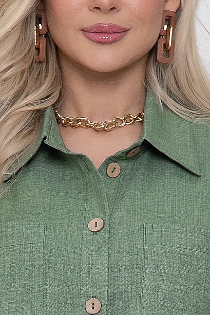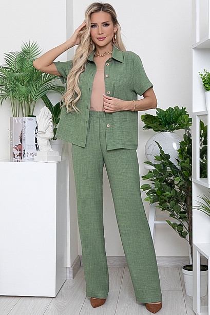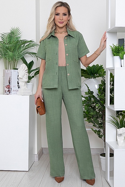 Брючный комплект из комфортного текстильного полотна.Рубашка свободного силуэта с отложным воротником на стойке и центральной застежкой на пуговицы.По переду накладные карманы.Брюки свободного,прямого силуэта с эластичной резиной по поясу и функциональными карманами по бокам.