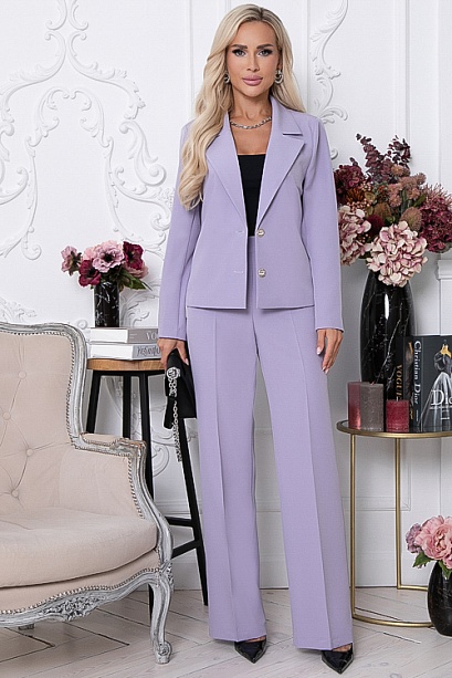Комплект брючный из костюмной ткани.Жакет прямого силуэта с отложным воротником с лацканами.Рукав втачной длинный.Застежка на две пуговицы.Брюки прямые,свободные с заутюженными стрелками,по бокам функциональные карманы.Пояс притачной с эластичной резиной по спинке.В среднем шве переда имитация гульфика.