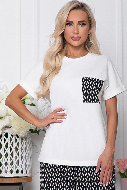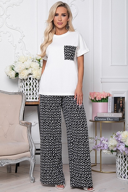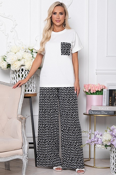 Комплект состоит из брюк и блузки.Блузка-футболка свободного силуэта из комфортного трикотажного хлопка(кулирная гладь производство Турция).Легкие брюки свободного,прямого силуэта из комфортного вискозного полотна, удобную посадку по талии обеспечивает эластичный пояс на резинке с кулиской,В боковых швах функциональные карманы.