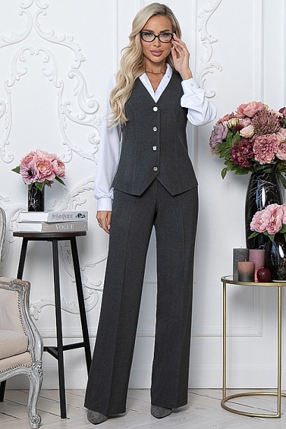 * Комплект из комфортной,качественной костюмной ткани (ткань производство Турция) состоящий из жилета и брюк. Жилет полуприлегающего силуэта с центральной застежкой на пуговицы на подкладе.Брюки прямые,свободные с заутюженными стрелками,по бокам функциональные карманы.Пояс притачной с эластичной резиной по спинке,застежка молния.