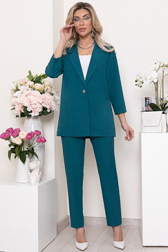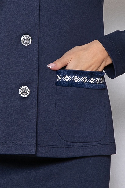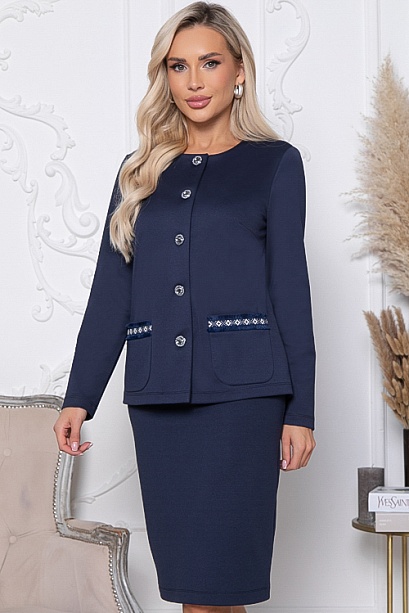Комплект из трикотажного полотна джерси,состоит из жакета и юбки.Жакет в стиле шанель  прямого,свободного силуэта с центральной застежкой на пуговицы.По переду накладные карманы с декоративной тесьмой.Юбка карандаш по талии  эластичная резина,в среднем шве спинки шлица.