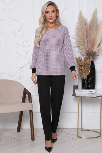 * Комплект состоящий  из блузки и брюк. Блузка свободного силуэта  из текстильного полотна, низ рукавов с манжетами из трикотажной рибаны.Брюки из костюмной ткани с высокой посадкой, зауженные к низу, по поясу эластичная резина .В среднем шве  переда имитация гульфика. По бокам  функциональные карманы. Заутюженные  стрелки придают стройность фигуре.