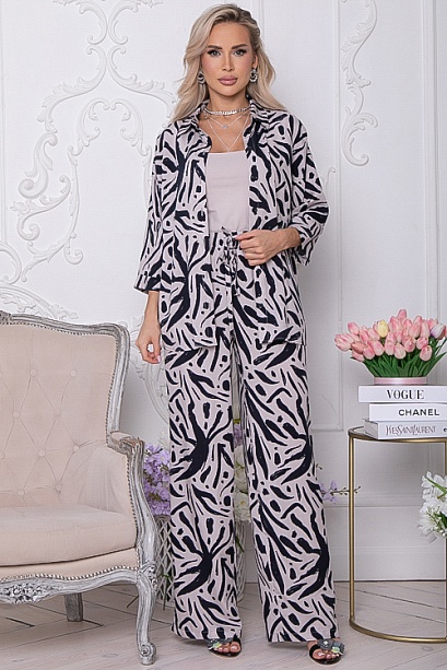 Комплект из комфортного вискозного текстильного полотна,состоит из рубашки и брюк.Рубашка свободного силуэта с центральной застежкой на пуговицы.Воротник отложной на стойке.