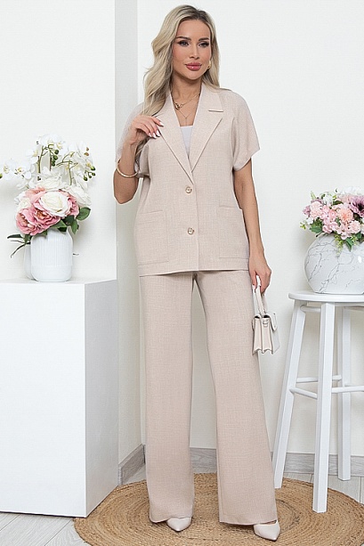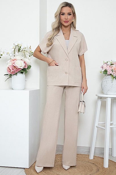 Комплект из легкой костюмной ткани.Жакет свободного силуэта с цельнокроеными рукавами, центральной застежкой на две пуговицы и удобными функциональными карманами по переду.Воротник отложной с лацканами.Брюки свободного,прямого  силуэта,  удобную посадку по талии обеспечивает эластичный пояс,который по бокам и спинке собран на резину,в боковых швах функциональные карманы.