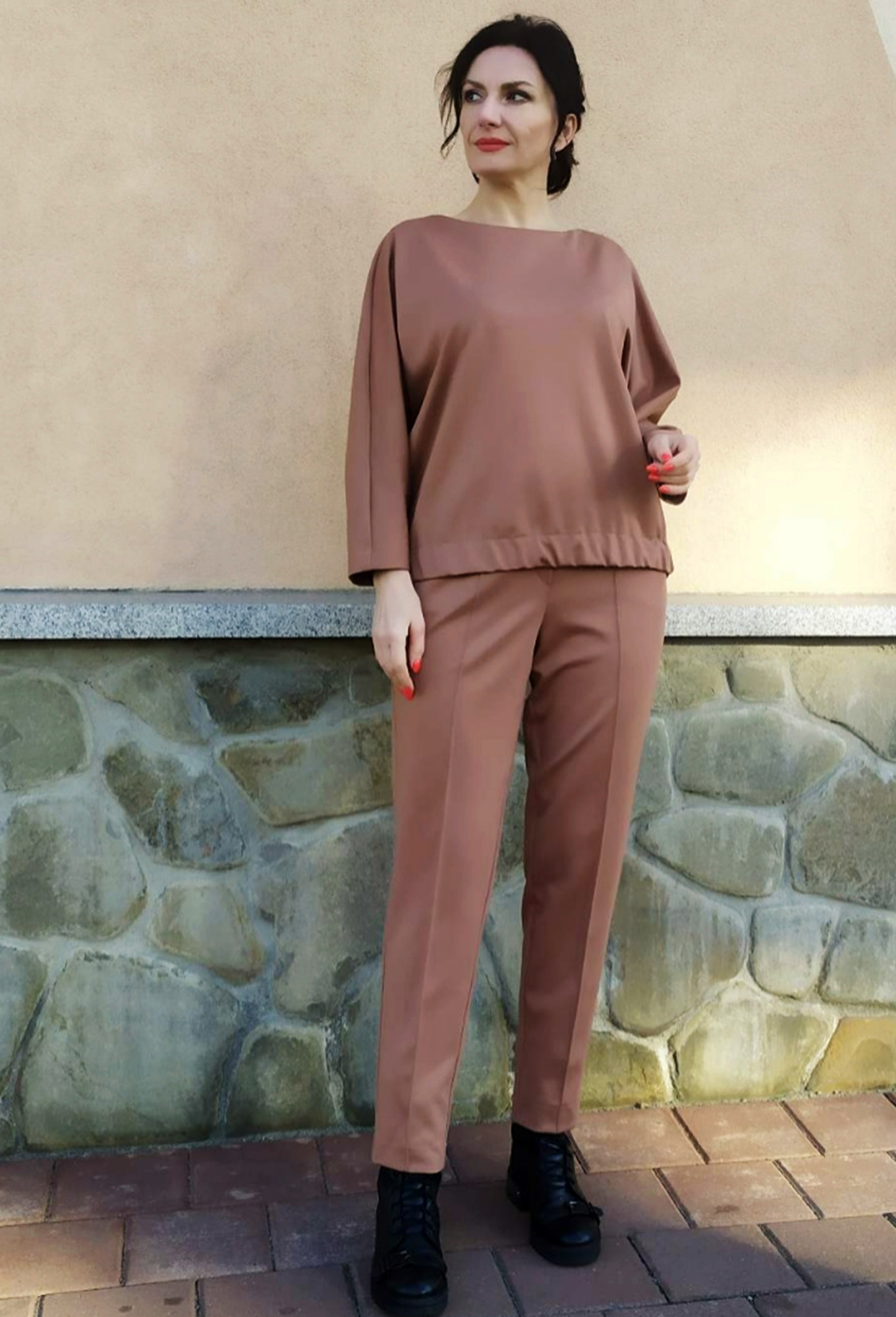 Модель: Амелия Люкс 35-21 какао Р..показатьост: 164 см (девушка на фото ростом 170см) Сезон: круглогодичный Тип ткани: 75% вискоза, 20% нейлон, 5% эластанКомплект состоит из свитшота и брюк . Свитшот с горловиной лодочка, рукав летучая мышь длиной 7/8. Низ свитшота собран на широкую резинку. Брюки с высокой посадкой ,имеют спокойное облегание в области бедер, к низу обужены. По переду на брюках застрочены стрелки, талия на резинке,на задней части брюк листочки . Длина блузы 60см,длина брюк 98см.ост: 164 см (девушка на фото ростом 170см)