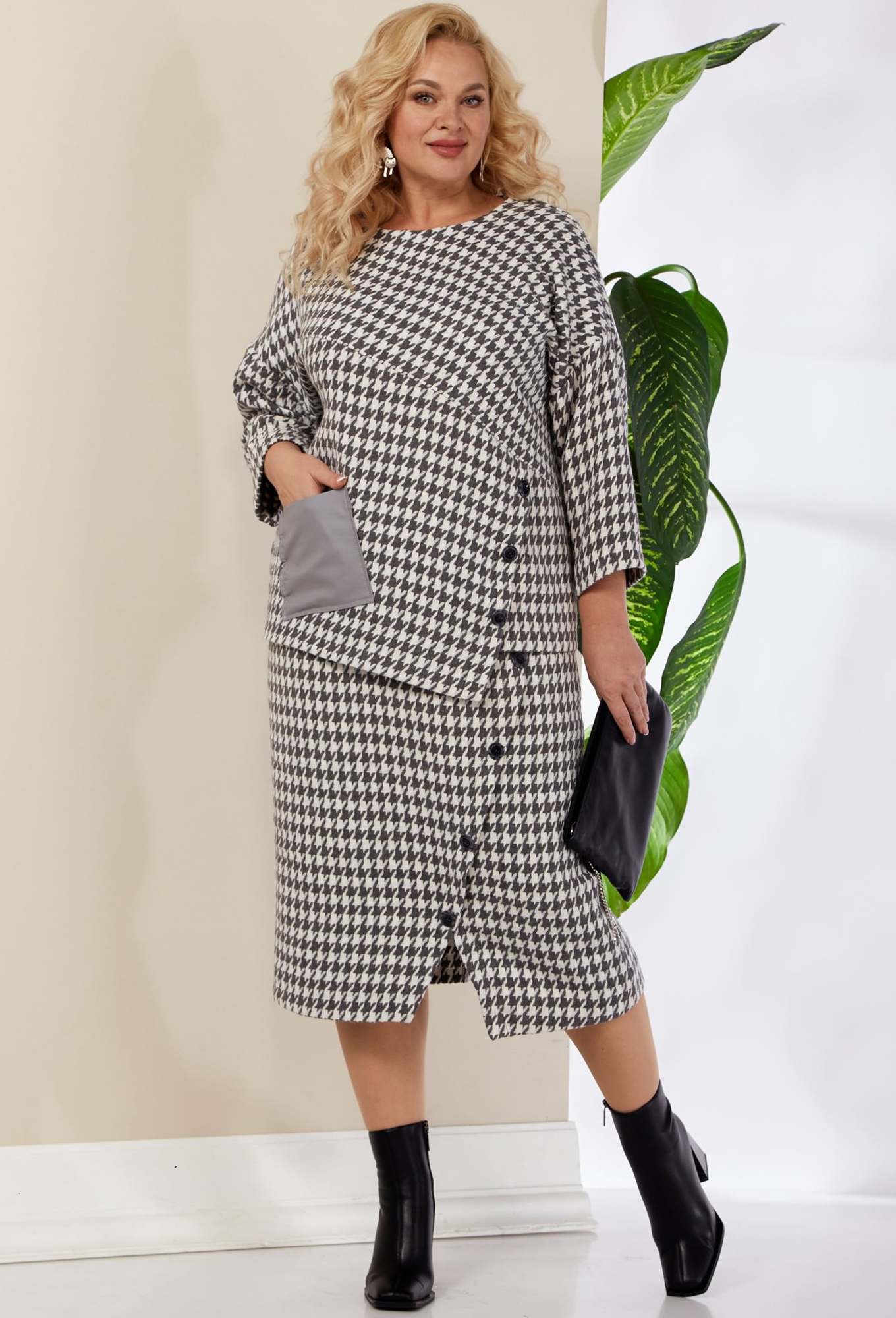 Модель: Анастасия 1027 графит Рос..показатьт: 164 см (девушка на фото ростом 170см) Сезон: Осень-Зима Тип ткани: ПЭ-70%, Хлопок -30%Комплект женский 2-х предметный ( блузка, юбка) из текстильной ткани. Блуза прямого силуэта со спущенным плечом, низ по полочке фигурный, симметричный. По полочке идет кокетка в виде подреза, отделка в виде пуговиц и накладной карман (из эко-кожи). По спинке средний шов, рукав 3/4 длины. Юбка зауженная к низу, по полочке идет ассиметричный подрез с пуговицами. По спинке средний шов, шлица , пояс отрезной с резинкой.