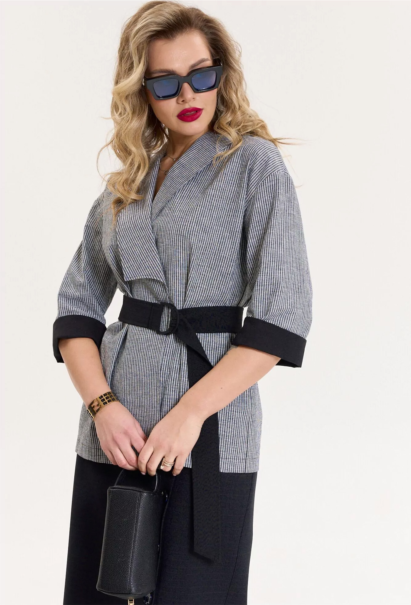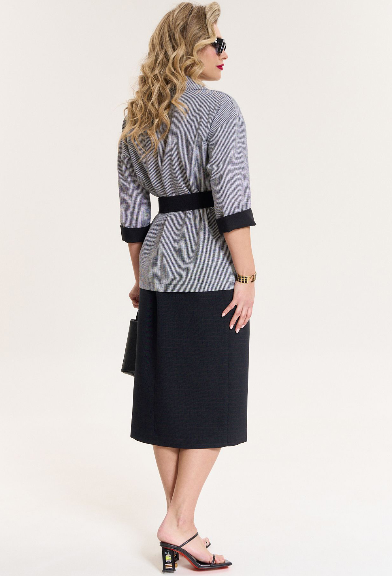 Модель: Анастасия 1079 черный клетка ..показатьРост: 164 см (девушка на фото ростом 170см) Сезон: Круглогодичный Тип ткани: Верх- лен-55%, х/б- 45%; Низ- ПЭ-55%, лен-15%, х/б-15%, вискоза-15%Комплект женский 2-предметный (жакет и юбка). Жакет из текстильной ткани в клетку прямого силуэта, со спущенным плечом. Воротник - ассиметричный: апаш и шалевый. Рукав 3/4 длины, с отложной манжетой из отделочной ткани. Застежка - на запах, фиксируется съемным поясом. Юбка однотонная зауженная к низу, по полочке по линии колена - складка, переходящая в шлицу. Отделка в виде пуговиц. По спинке: средний шов, молния, пояс отрезной с резинкой.