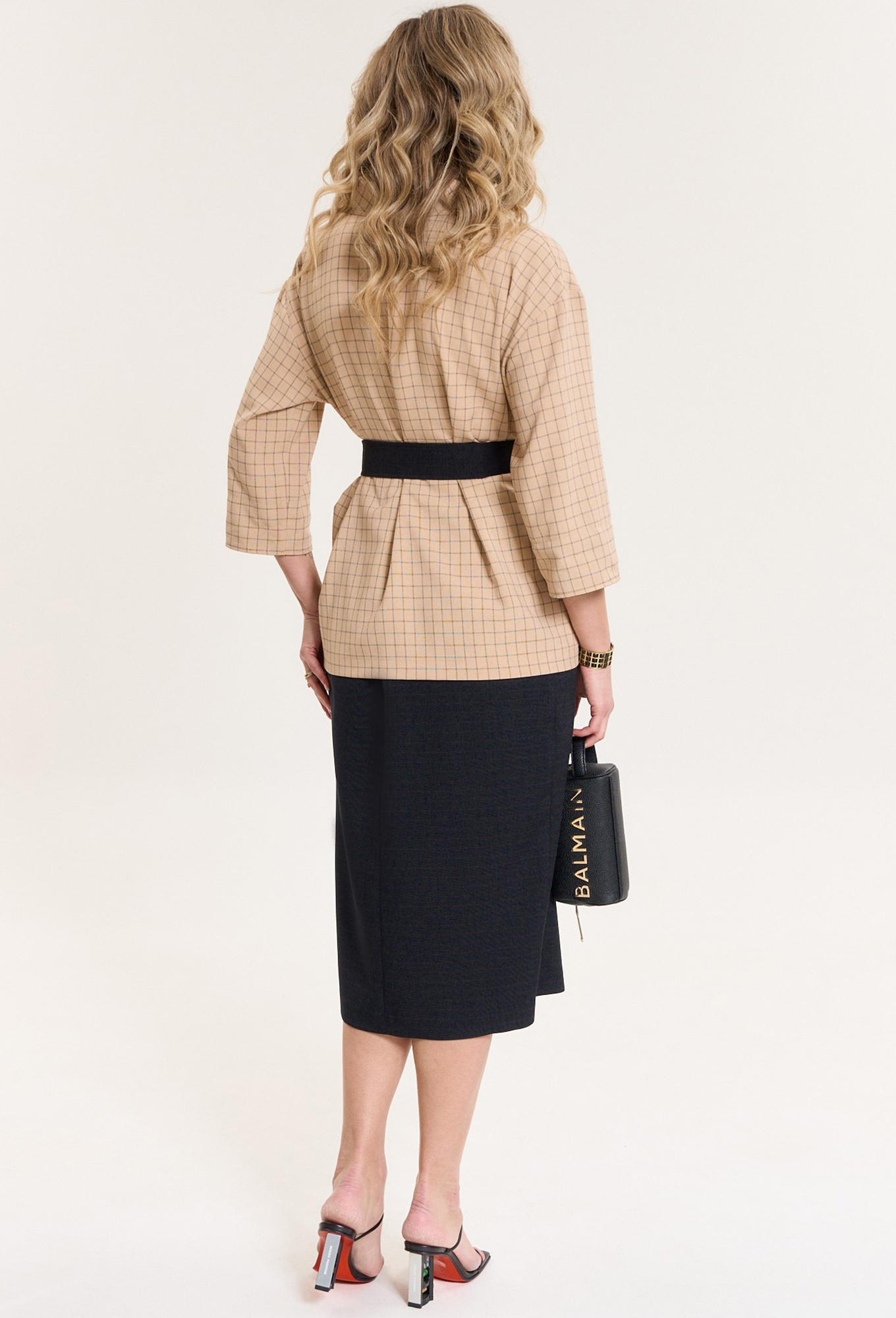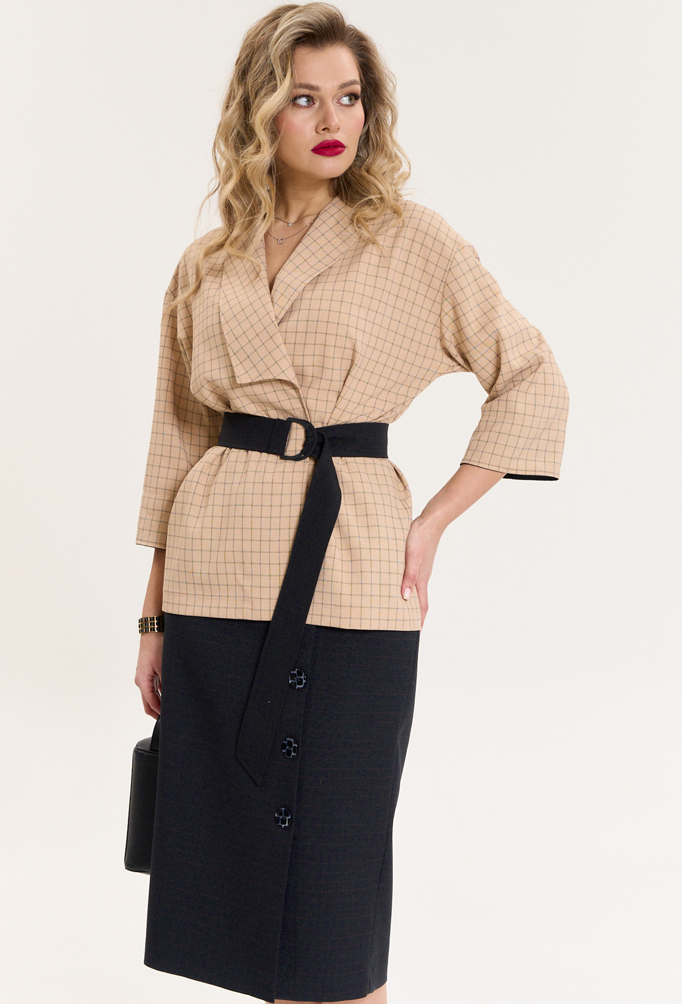 Модель: Анастасия 1081 бежево-черный ..показатьРост: 164 см (девушка на фото ростом 170см) Сезон: Круглогодичный Тип ткани: Верх- ПЭ-90%, Вискоза-10%; Низ- ПЭ-60%, Вискоза-38%, СП-2%Комплект женский 2-предметный (жакет и юбка). Жакет из текстильной ткани в клетку прямого силуэта, со спущенным плечом. Воротник - ассиметричный: апаш и шалевый. Рукав 3/4 длины, с отложной манжетой из отделочной ткани. Застежка - на запах, фиксируется съемным поясом. Юбка однотонная зауженная к низу, по полочке по линии колена - складка, переходящая в шлицу. Отделка в виде пуговиц. По спинке: средний шов, молния, пояс отрезной с резинкой.