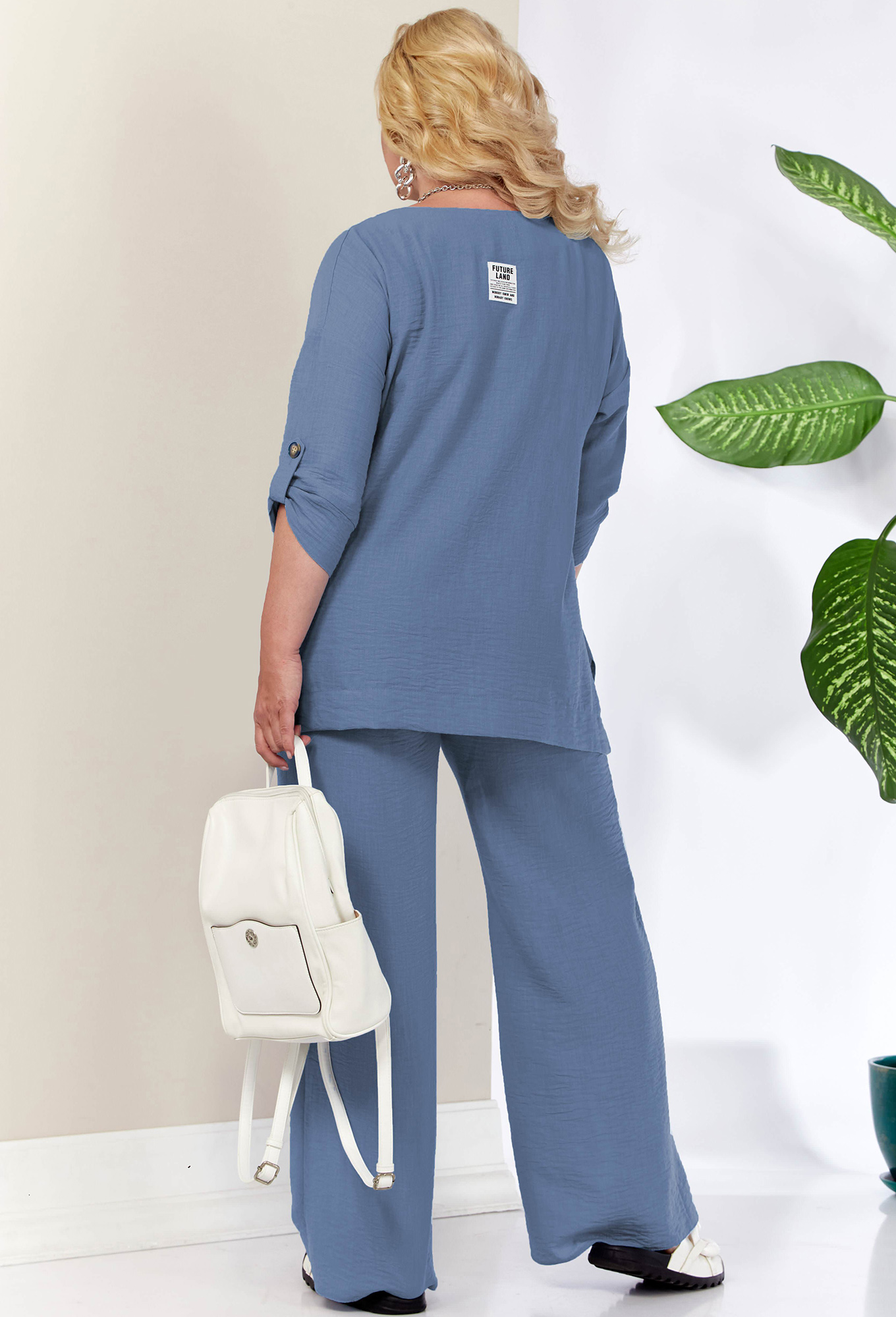 Модель: Анастасия 1102 синий Рост..показать: 164 см (девушка на фото ростом 170см) Сезон: Весна-Лето Тип ткани: Полиэстер - 75%, Лен - 15%, Хлопок - 10%Комплект женский 2-х предметный (блузка, брюки) из тонкой и легкой текстильной ткани- лучший выбор на лето. Отлично подойдет как для повседневной носки (работа, офис, прогулки), так и для праздничных выходов. Достаточно дополнить его соответствующими аксессуарами. Предметы комплекта легко будут сочетаться с вещами из Вашего гардероба. Блузка со спущенным плечом, трапециевидного силуэта с разрезами по бокам. Рукав 3/4 длины с манжетой. Длина рукава фиксируется патой. В качестве декора - нашивка по низу блузки и в верхней части спинки. Брюки прямые, пояс на резинке. По передней части брюк идут подрезы с карманами. Длина по спинке (50-54) - 70 см, (56-60) - 74 см. Длина рукава: (50-60) - 30 см. Длина брюк: (50-54) - 104 см, (56-60) - 107 см.: 164 см (девушка на фото ростом 170см)