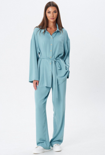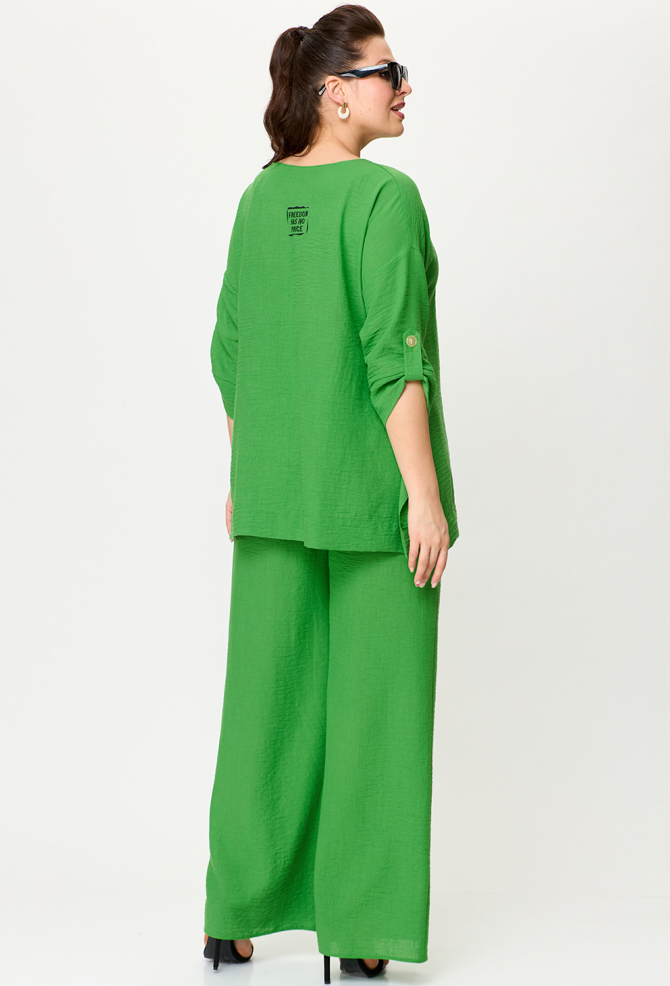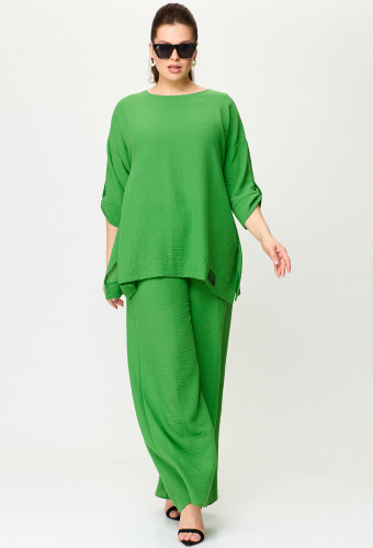 Модель: Анастасия 1102 зелёный Ро..показатьст: 164 см (девушка на фото ростом 170см) Сезон: Весна-Лето Тип ткани: Полиэстер - 75%, Лен - 15%, Хлопок - 10%Комплект женский 2-х предметный (блузка, брюки) из тонкой и легкой текстильной ткани- лучший выбор на лето. Отлично подойдет как для повседневной носки (работа, офис, прогулки), так и для праздничных выходов. Достаточно дополнить его соответствующими аксессуарами. Предметы комплекта легко будут сочетаться с вещами из Вашего гардероба. Блузка со спущенным плечом, трапециевидного силуэта с разрезами по бокам. Рукав 3/4 длины с манжетой. Длина рукава фиксируется патой. В качестве декора - нашивка по низу блузки и в верхней части спинки. Брюки прямые, пояс на резинке. По передней части брюк идут подрезы с карманами. Длина по спинке (50-54) - 70 см, (56-60) - 74 см. Длина рукава: (50-60) - 30 см. Длина брюк: (50-54) - 104 см, (56-60) - 107 см.ст: 164 см (девушка на фото ростом 170см)