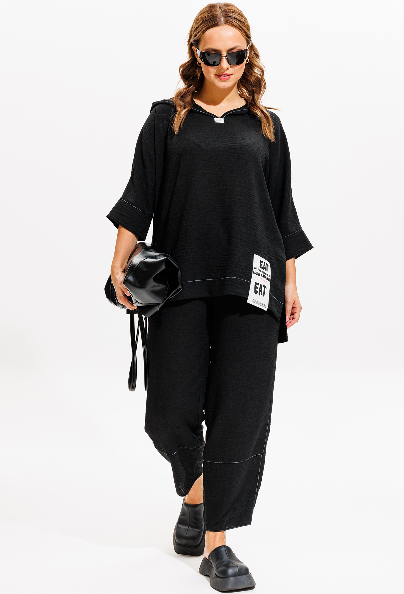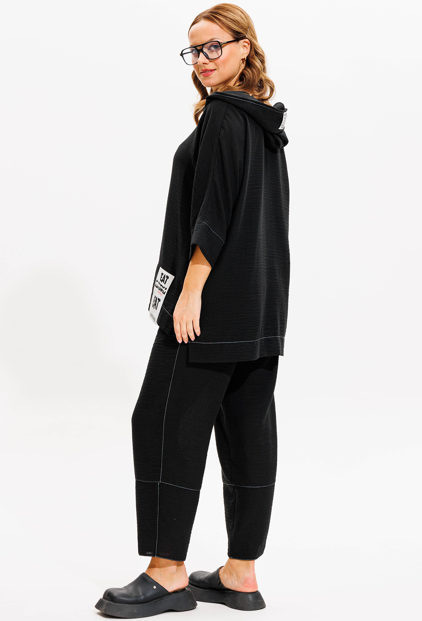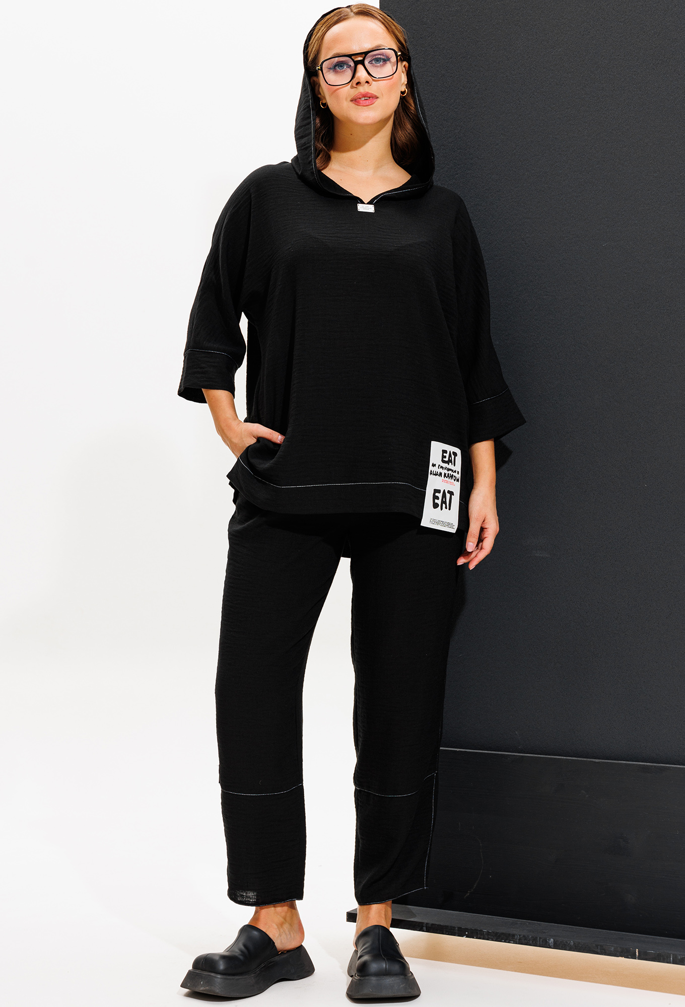 Модель: Анастасия 1118 чёрный Рос..показатьт: 164 см (девушка на фото ростом 170см) Сезон: Весна-Лето Тип ткани: Полиэстер - 75%, Лен - 15%, Хлопок - 10%Комплект женский 2-х предметный (блузка, брюки). Модель из текстильной ткани. Комплект легки и дышащий - идеальный вариант на лето. Отлично подойдет для повседневной носки. Блузка с капюшоном прямого силуэта с цельнокроеным рукавом "летучая мышь", 3/4 длины с манжетой. Спинка длиннее полочки. По бокам разрезы. Брюки "бананы", пояс на резинке, по бокам карманы. По низу брюк-подрезы. В качестве декора: по капюшону и полочке -нашивки, отделка в контраст ткани.