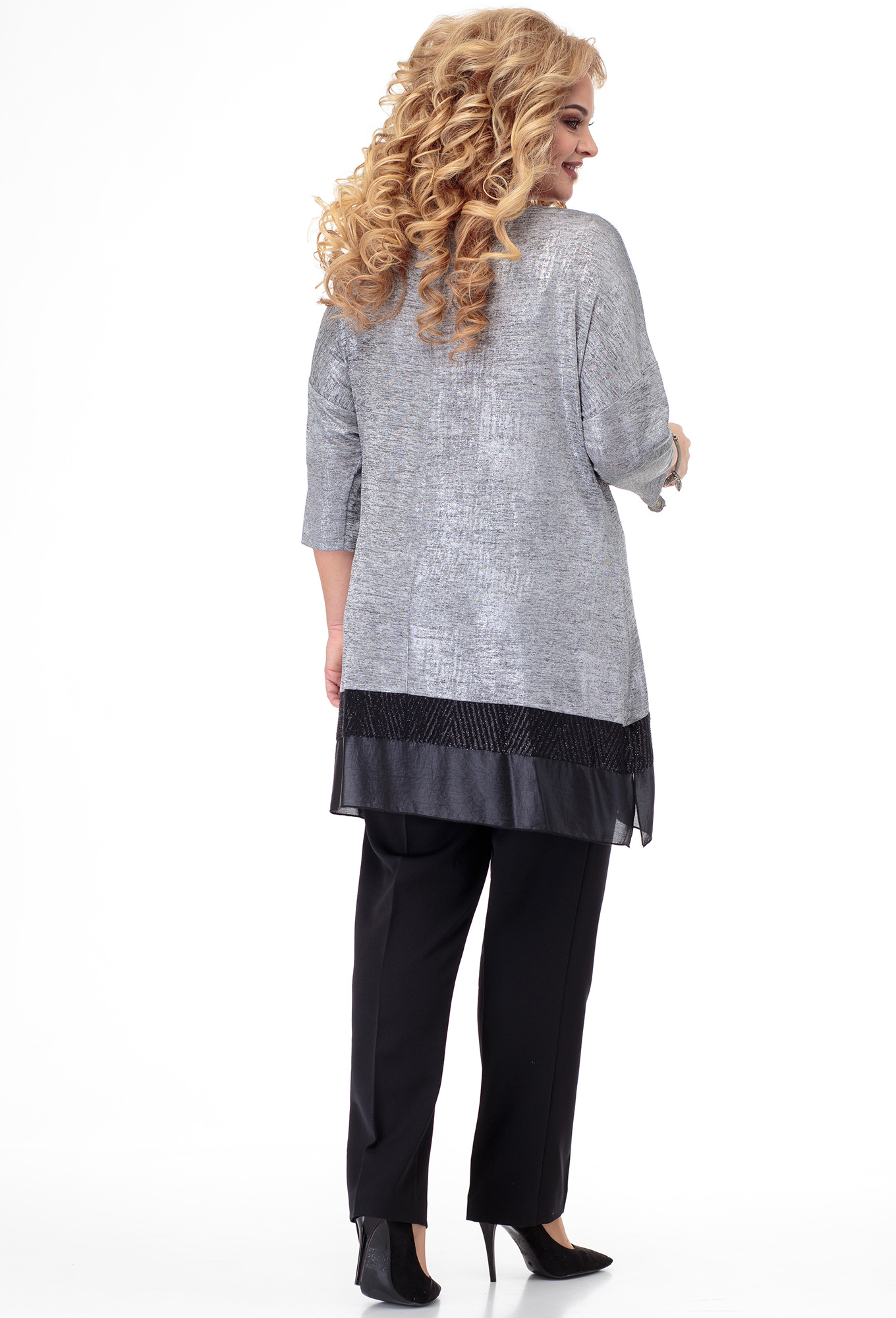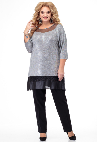 Модель: Анастасия 350 серый Рост:..показать 164 см (девушка на фото ростом 170см) Сезон: круглогодичный Тип ткани: Туника – полиэстер 95%, вискоза 5%. Брюки – полиэстер 100%Комплект женский 2-х предметный: туника, брюки. Туника из трикотажного полотна, сетки, шифона, с пайетками на подкладке. Брюки из текстильной ткани "елочка". Туника расширена к низу. По переду туники -кокетка из сетки, на которой наклеены черные стразы. По низу туники - отрезная узкая бейка из пайеток на подкладке. Рукав цельнокроеный, втачной, длиной 3/4. Низ рукава и горловина спинки подшиты на распошивалке. Горловина переда окантована. По низу туники-полоска из шифона с углами по боковым швам. Низ полоски и углы обметаны на "улитке". Брюки заужены к низу, в верху на широкой обтачке. По переду - застежка на молнию и на 2-е петли и 2-е пуговицы. На задних половинках брюк-талиевые вытачки. Длина туники-82см; длина рукава-48см; длина брюк-102см. 164 см (девушка на фото ростом 170см)