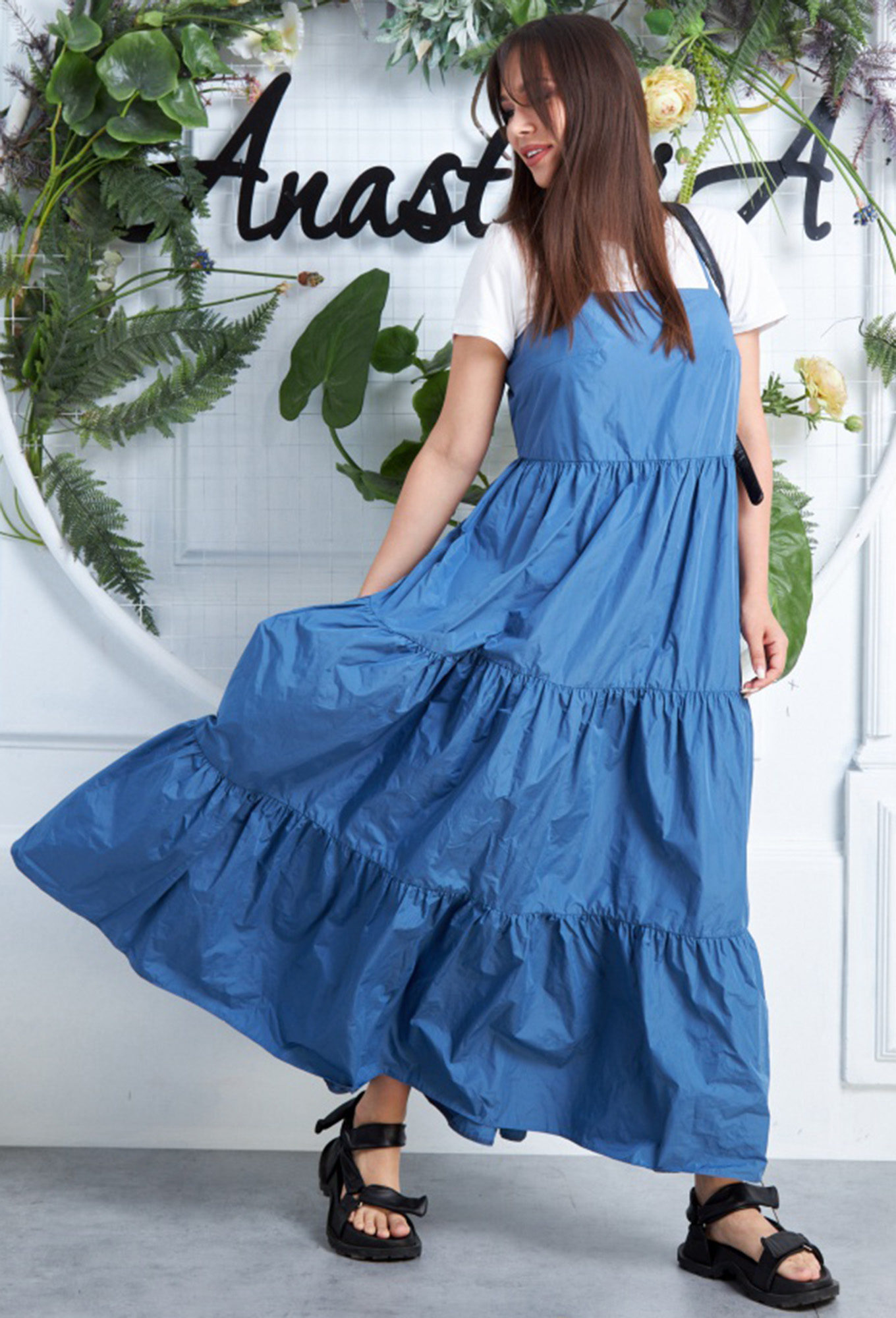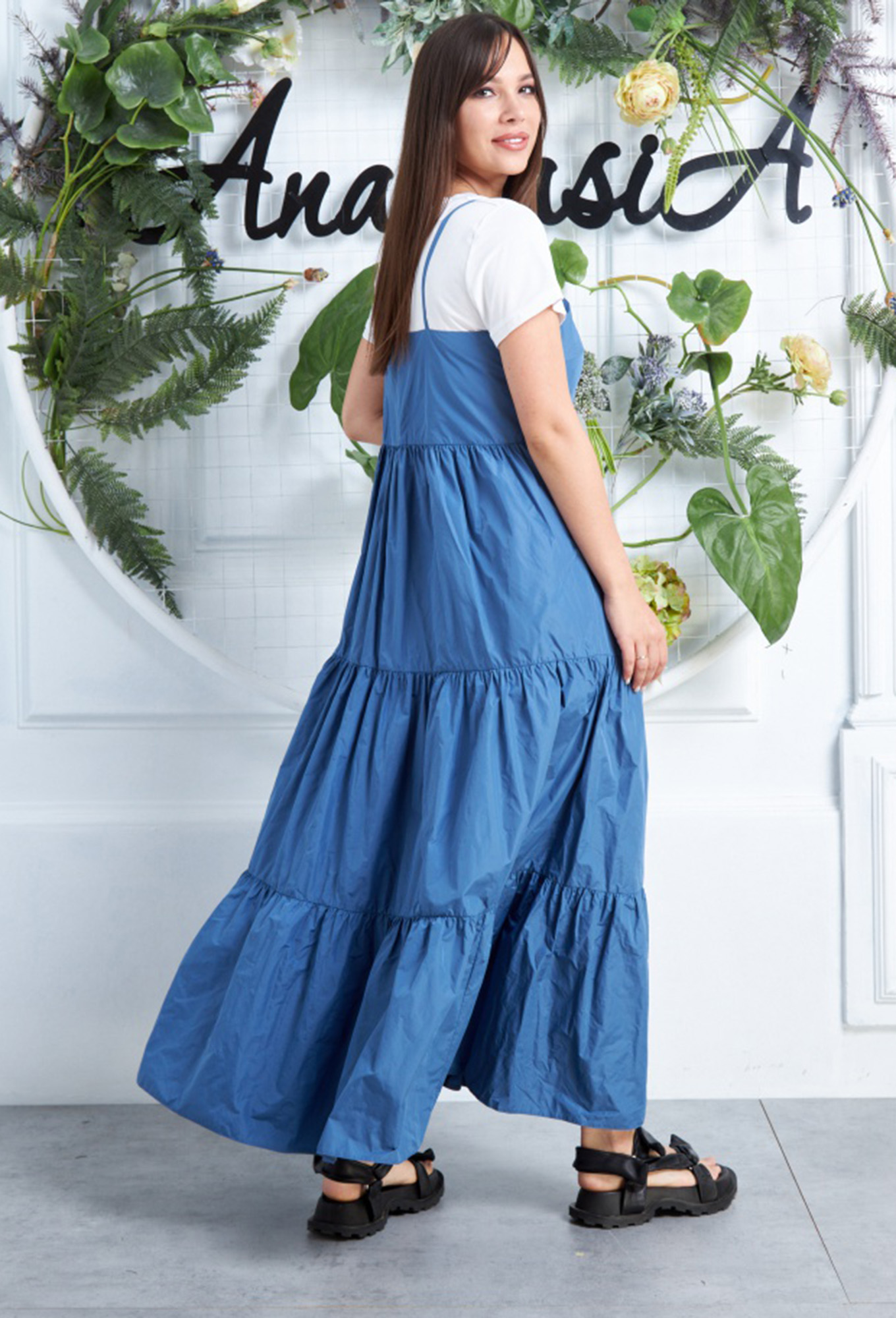 Модель: Анастасия 630 синий Рост:..показать 164 см (девушка на фото ростом 170см) Сезон: весна-лето Тип ткани: Платье-полиэстер 100% Майка- вискоза 65%пэ-32% Спандекс-3%Комплект женский 2-х предметный (майка и платье-сарафан). Платье-сарафан на брителях, в левом боковом шве молния. По талии отрезное и 3 волана присобраны. Майка прилегающего силуэта, рукав короткий. По горловине и низу рукава майки идет бейка. Длина платья: 120см. Длина майки: 60см. 164 см (девушка на фото ростом 170см)