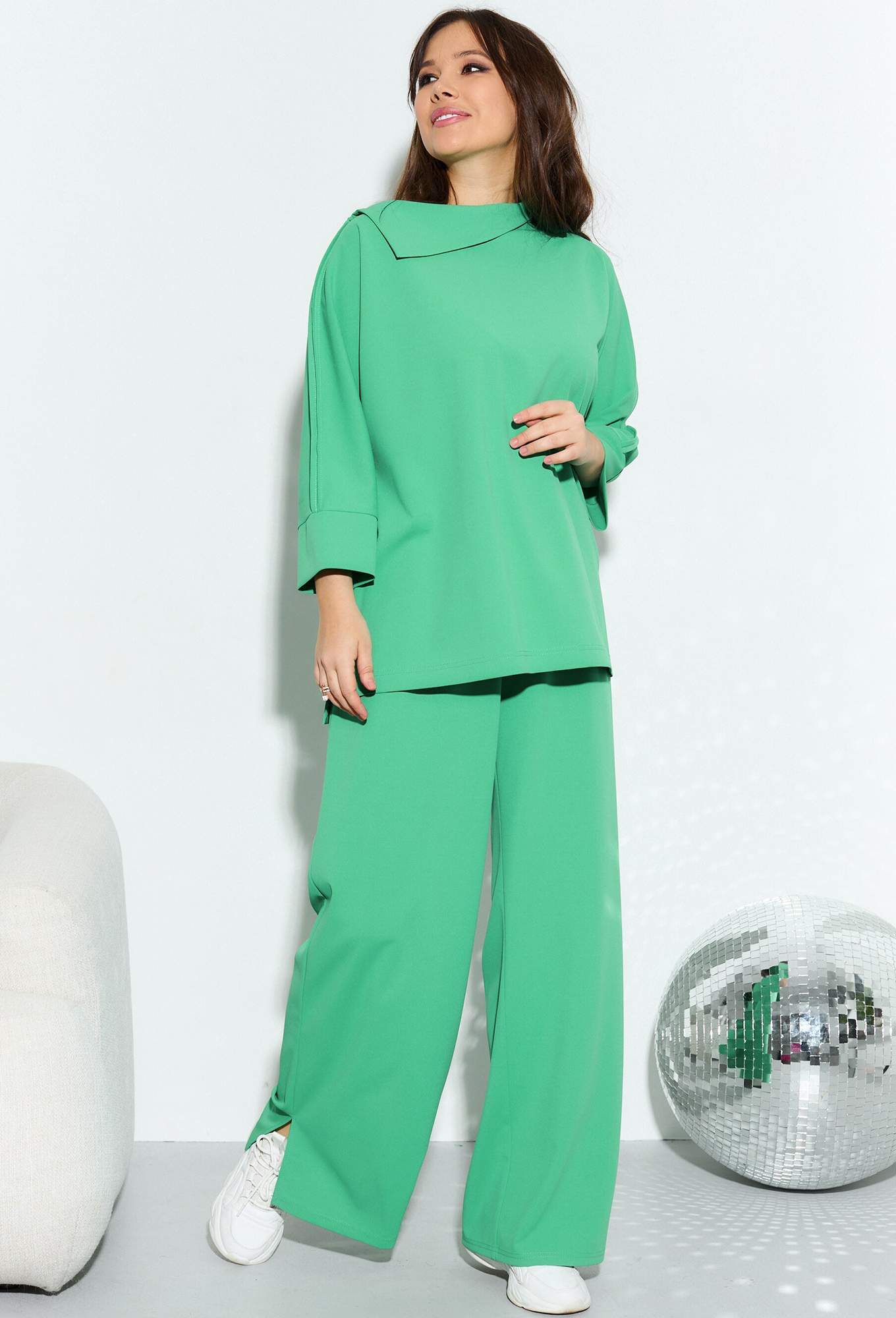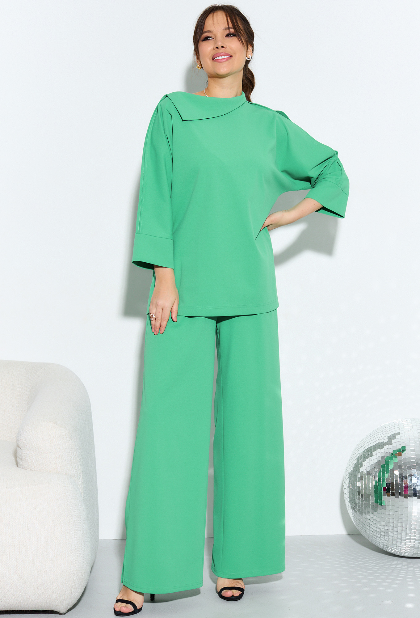 Модель: Анастасия 965 зеленый Рос..показатьт: 164 см (девушка на фото ростом 170см) Сезон: Круглогодичный Тип ткани: ПЭ-95% Спандекс-5%Комплект женский 2-х предметный (блузка, брюки) из трикотажного полотна. Блузка прямого силуэта, рукав- "летучая мышь", по бокам разрезы, спинка длиннее полочки. Горловина ассиметричная с отложным воротником. Верхний шов рукава идет на верх в разутюжку, с одной стороны "слезка". По низу рукава идет манжет. Брюки прямые, по низу разрез, пояс на резинке, по бокам карманы.
