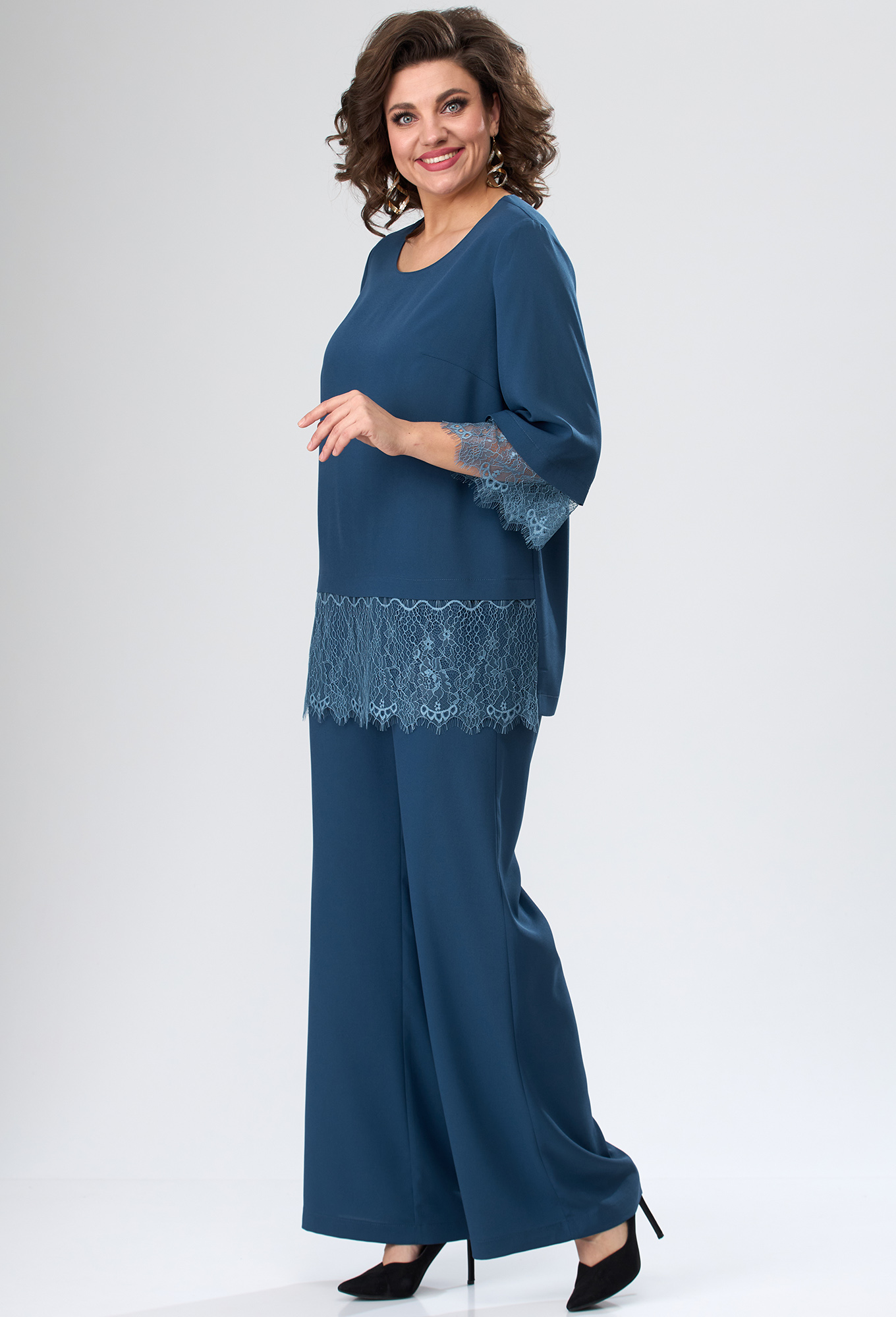 Модель: Анастасия Мак 1079 морская волна..показатьli> Рост: 164 см (девушка на фото ростом 170см) Сезон: Круглогодичный Тип ткани: 100% ПЭКостюм состоит из блузки и брюк. Костюм выполнен из однотонной ткани, в качестве отделки использовано кружевное полотно. Блузка прямого силуэта. Полочка блузки с нагрудными вытачками, горловиной круглой формы, в нижней части полочки обработана кокетка с наложением кружевного полотна. Спинка со средним швом. Рукав длиной ¾, втачной, одношовный. По низу рукав обработан притачной манжетой из кружевного полотна. Брюки свободные, прямые, типа “поло”. На передней половинке выполнены наклонные карманы. Брюки на притачном поясе с эластичной тесьмой.